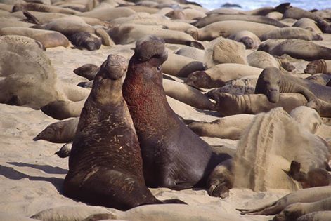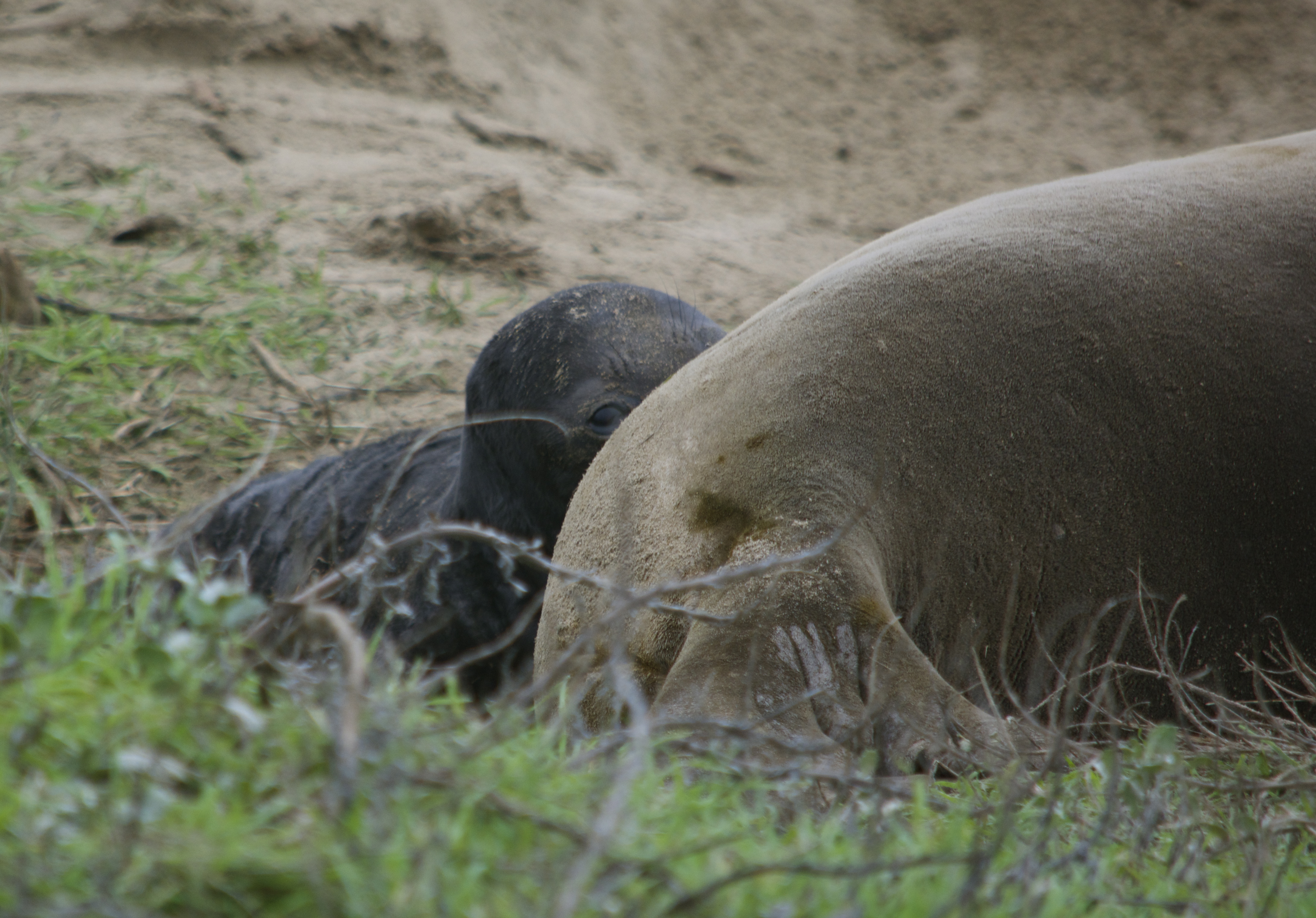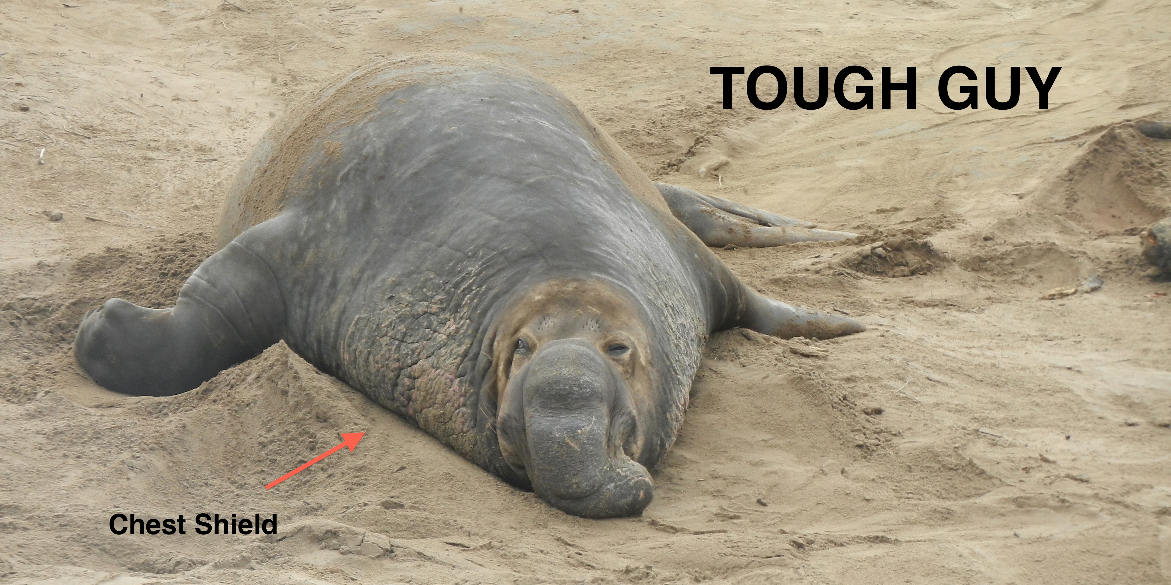 The first seals to show up are the enormous 14-16 feet long, 5,000 pound males, who begin sizing each other up and eventually engaging in intense battles to establish breeding rights. Like blubbery knights, these giants wear a “chest shield” of thick skin to protect them from enemy teeth during bouts. Their elephantine noses help them produce loud roars during competition, and also retain moisture during breathing, as they won’t leave the beach for food all season.