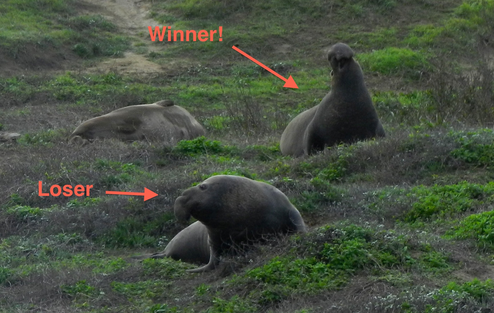 So what’s the prize? 40-50 lady friends. As females begin to trickle in, they form groups called “harems”. The winning male will breed with all the females in a harem. Competition is fierce over these 1000-pound females and bulls often end up bloodied and scarred, but they rarely fight to the death.