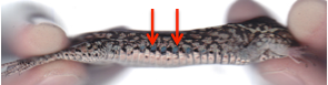 But until recently, most studies on lizard visual communication have neglected the UV component of color signals. This phenomenon can largely be attributed to humans’ inability to perceive such colors (“out of sight, out of mind”). Now, studies are finding that UV coloration is key to understanding many lizard interactions. In the Augrabies flat lizard, for example, UV throat color is a consistent predictor of fighting ability. In my work with the common wall lizard, I was interested in determining how spots on the lizards’ flanks (two of which are indicated by red arrows in the photo below) are used as a signal in competition between males. While the exact function of the spots in signaling remains unclear, my study showed that common wall lizards 1) have spots that reflect light in the UV region of the color spectrum, and 2) have receptors that are capable of detecting UV light.