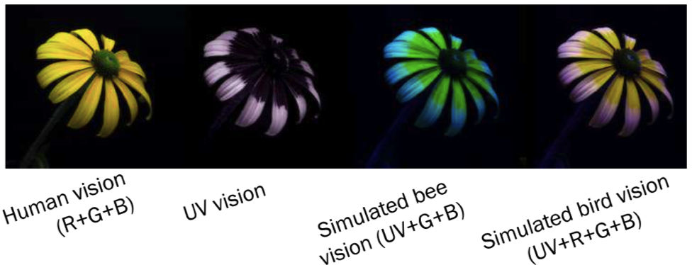On the other hand, animals that are able to see light reflected in the UV region of the color spectrum have an extra type of photoreceptor cell that is particularly sensitive to ultraviolet light. In the same way that having a missing or defective photoreceptor changes the colors that colorblind people see, having an UV photoreceptor changes the colors those animals can see. While the capacity to see in the UV was long-neglected, studies in recent years have shown that UV vision and coloration is widespread in non-mammalian vertebrates, including many species of birds, reptiles, insects, and fishes. The below pictures simulate how different animals with different