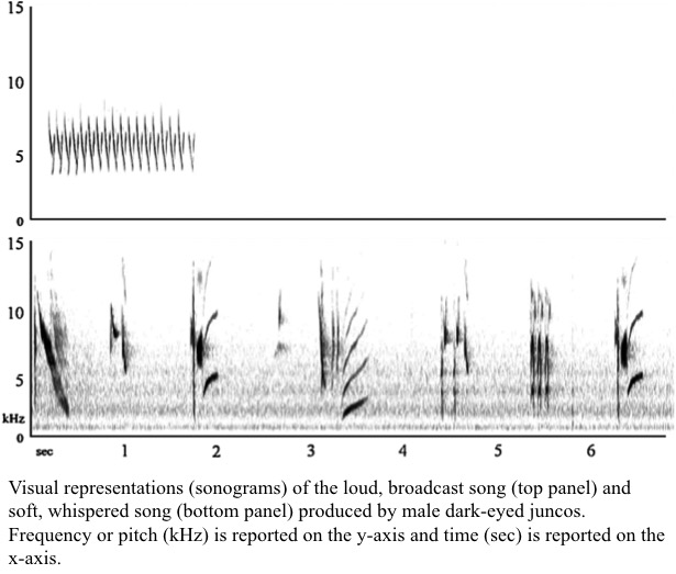 I study low-amplitude singing behavior in Dark-eyed Juncos (Junco hyemalis), a common species of sparrow that is a frequent winter visitor to bird feeders across the continental United States.5 When I first began my research, I was mainly interested in determining the social function of the junco’s whispered songs. In which types of social interactions do males whisper? Are the structure and functions of these whispered songs similar or different from the loud, broadcast songs that are easily overheard?