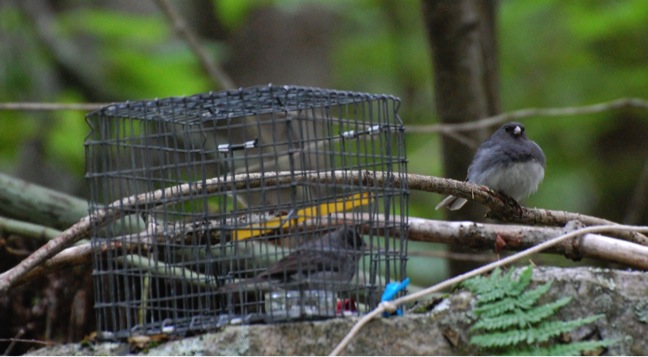 To begin to answer these questions, my team and I simulated social interactions on the territories of wild, male juncos and observed the types of songs that males produced in each social context.4 To simulate an aggressive interaction with a rival male, we placed a live, caged male junco on a male’s territory and also had a speaker nearby playing a recording of a loud, broadcast junco song. Then to simulate a courtship interaction we presented a live, caged female and played a recording of a female mating call.