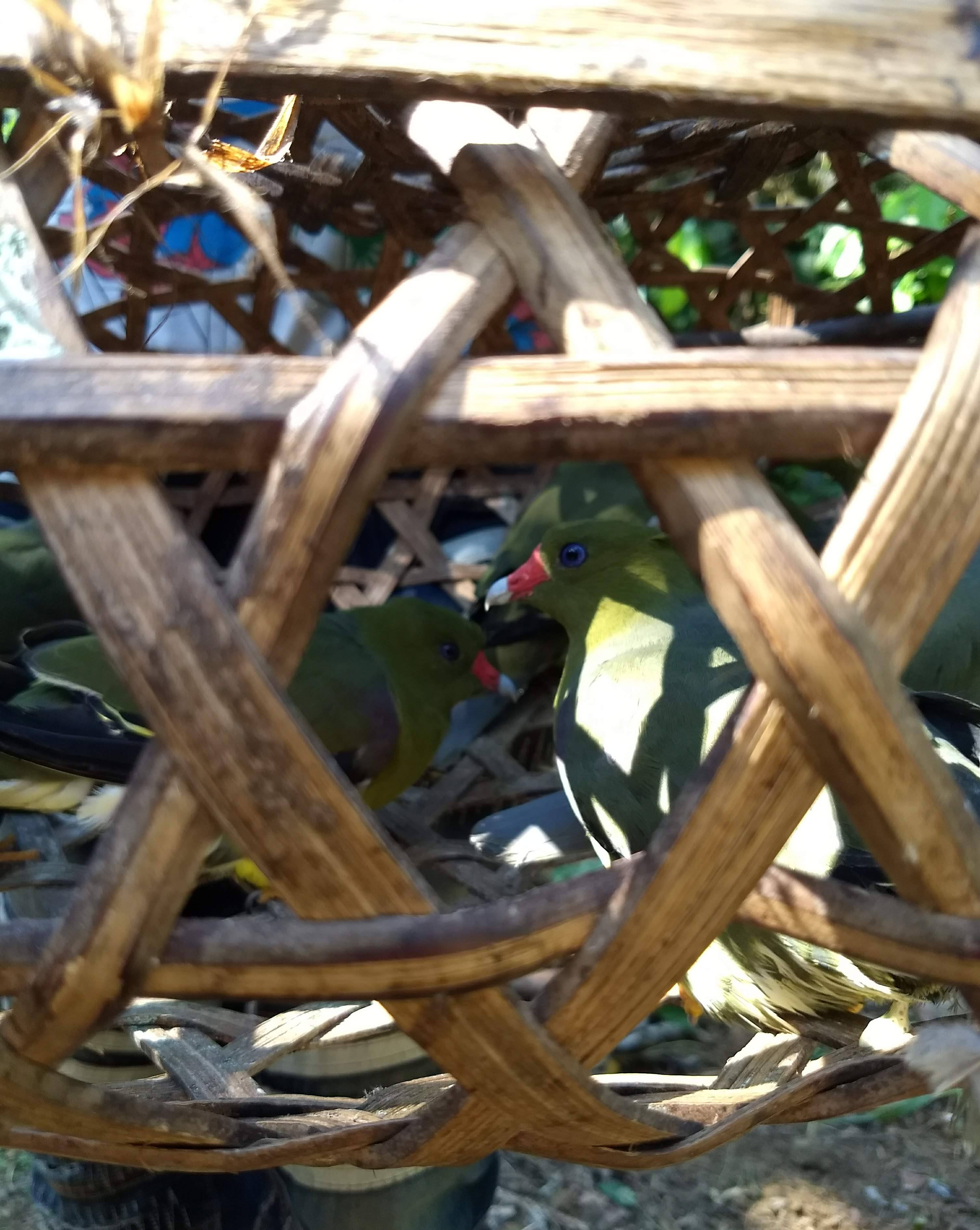 After this crossing, we took a short break at a pigeon hunting camp. I had heard about the traditional pigeon hunting practices in the North Kivu province of DRC and was fascinated. The head pigeon hunter was eager to share his stories and had brought out a basket that contained a few green pigeons.
