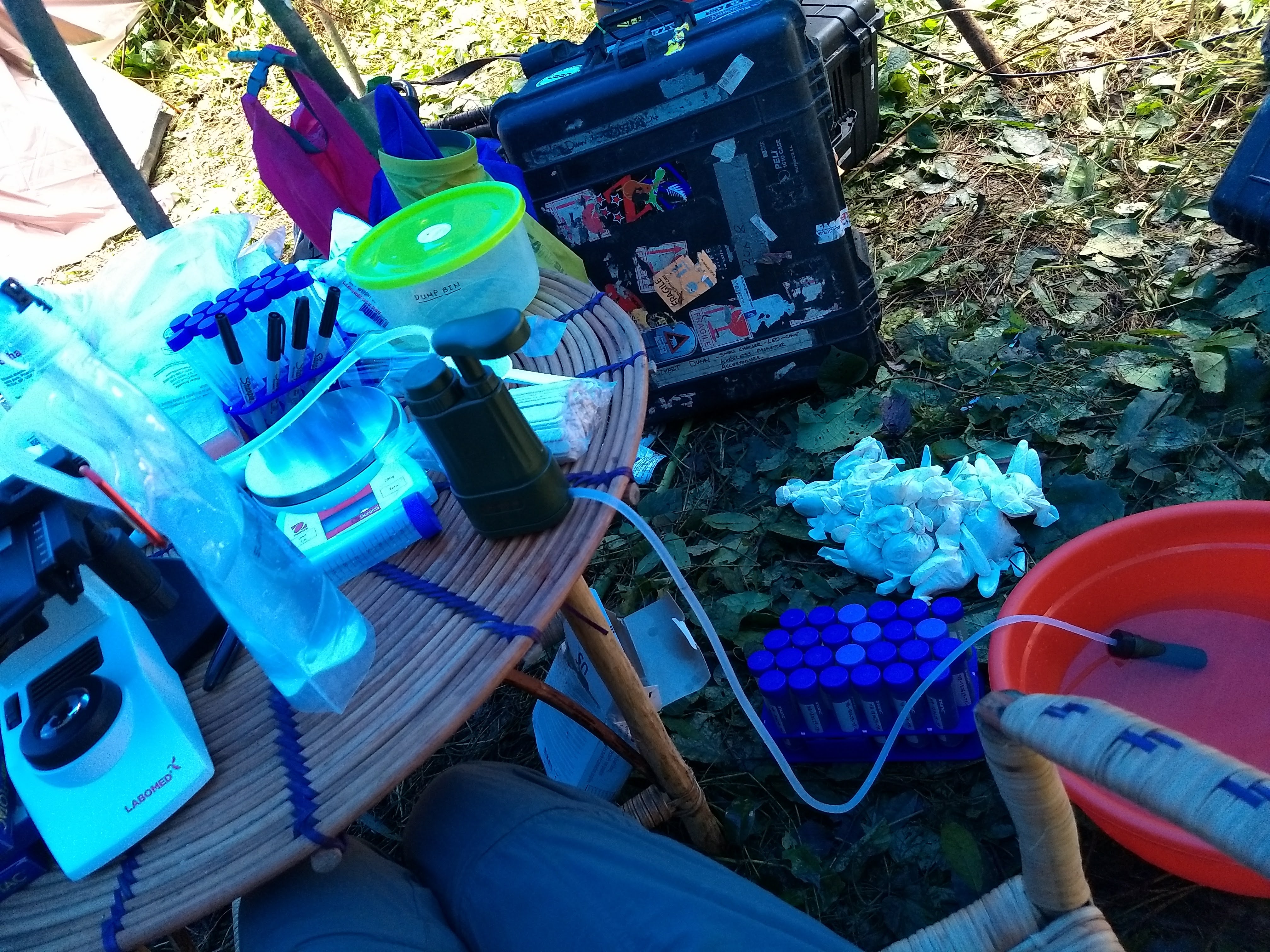 When we finally arrived at our campsite, happy with the first gorilla fecal samples of the field season, we were exhausted. But my work wasnโt over: since I had collected fecal samples that day, I would need to process them immediately the next morning, so it was vital to prepare my temporary lab station. The field team has setup and dismantled temporary campsites in the forest countless times, and within minutes a large blue tarp was erected and tied down to short, stout saplings. I quickly set up my test tube racks, microscope, weighing scale, water filtration system, and wash buckets. When I went to bed that night, I reapplied the orange palm oil, somewhat skeptical that this loudly-colored ointment was going to do any good. I needed to be on top of my game for the next few days of sample processing and hiking to collect additional fecal samples. I fell asleep, doubtful, but happy with the unforeseen success of our first day in the field.