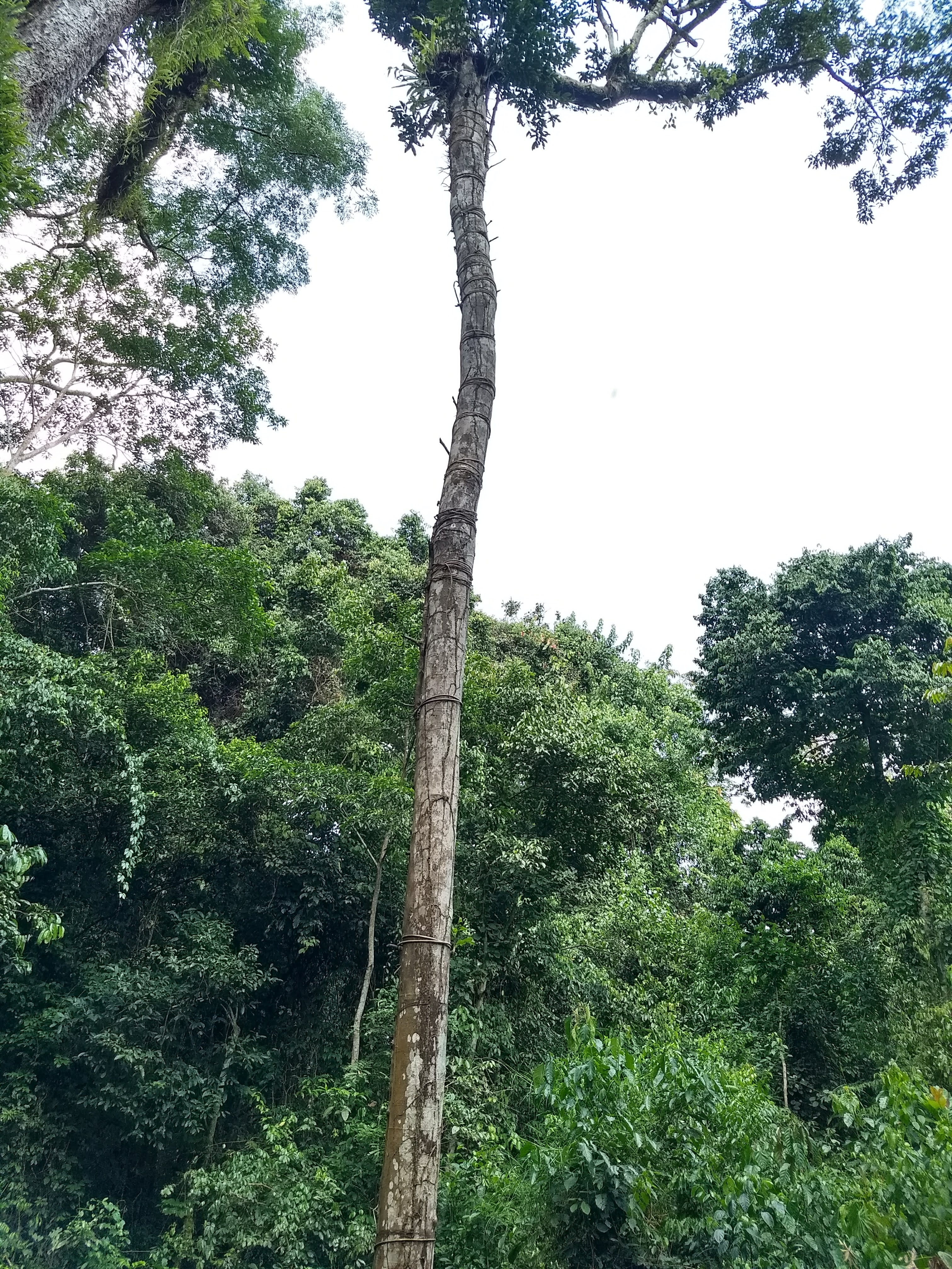 Capturing green pigeons is an involved process and the technique has been passed down for generations in his family. On this particular day, the pigeon hunter was wearing a Spiderman tank top. The irony was not lost on me that his livelihood depended on superhuman tree climbing skills to lay a sticky web (see pictures below). I peered at the basket of pigeons and a browning piece of paper nailed to a wooden stake at the center of this tiny hunting camp. Scribbled on the paper were the barter-and-trade values for x number of pigeons: a bar of soap could be bought for about 2 pigeons, while the value of two batteries was about 1 pigeon. This family could capture anywhere from 10-20 birds every day. That might not seem like much, but in an increasingly fragile and fragmented forest, imagine what multiple hunting camps could do to the pigeon population. In other tropical forests in Congo, these pigeons are even more at risk [1].