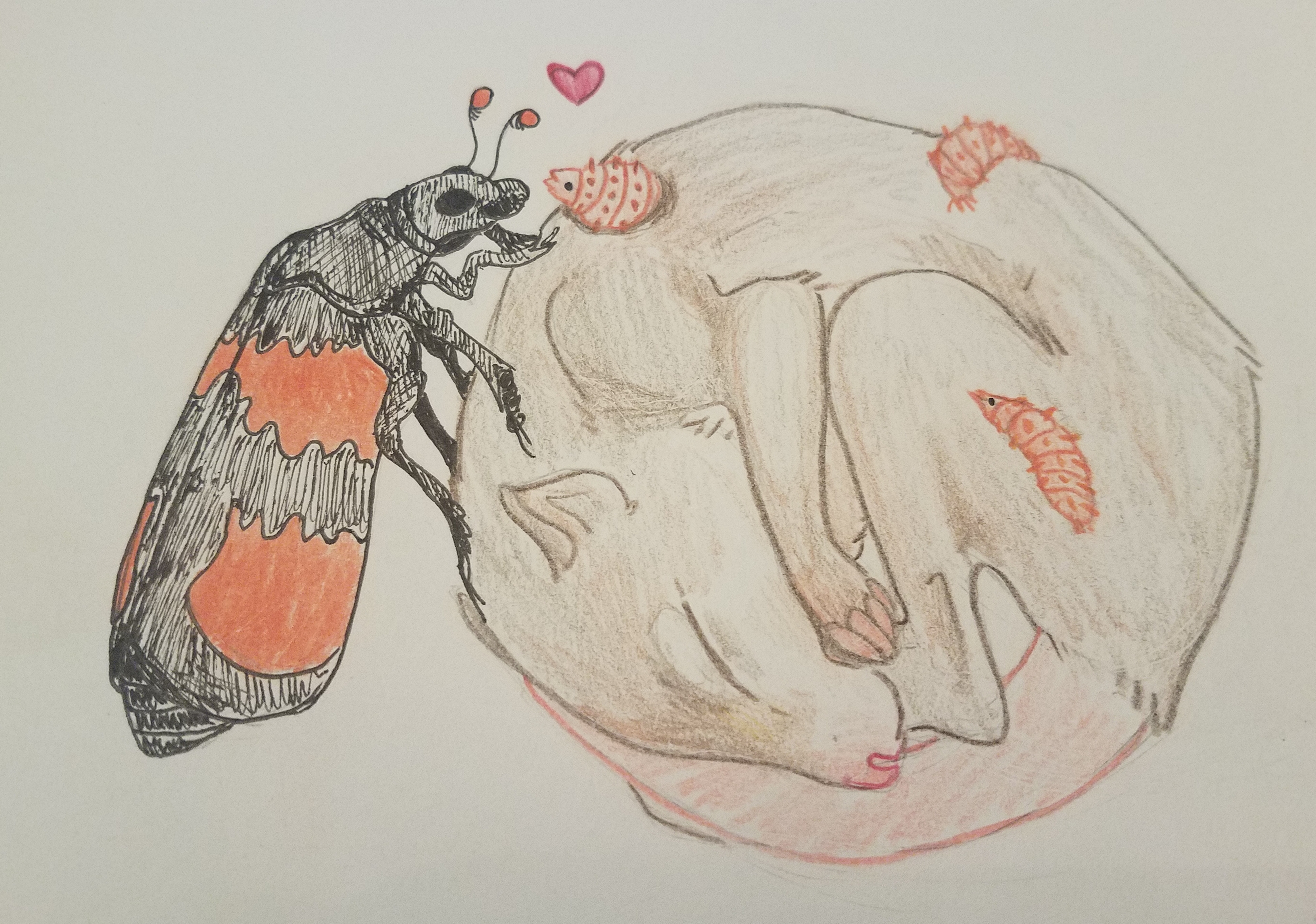 Burying beetles (subfamily Nicrophorinae) are some of the best parents in the insect world! Both the males and females carefully tend to the carcass on which they lay their eggs, spreading antibacterial secretions and enzymes to maintain the carrion’s condition. These “brood balls” decompose at far slower rates than normal carcasses, provide an easy-to-digest food for the grubs, and attract fewer predators due to the suppressed scent of decay.