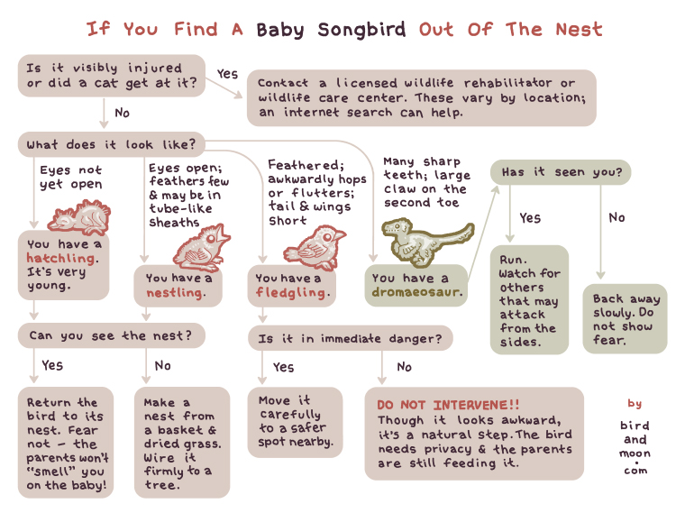 This myth likely originated to keep children from picking up baby birds – a generally good idea – but is the reasoning scientifically accurate? Let’s start with the physiology. Most birds – with a few notable exceptions (see these articles on vultures, seabirds, and kiwi) – are not known for their keen sense of smell. Additionally, chick abandonment from human touch is extremely rare – just ask any of the many scientists who handle chicks daily in their research! Basically, birds don’t seem to care about the scent of humans on their offspring, if they can detect our odor at all. However, this does not mean you should pick up baby birds! Instead, check out the flowchart below to learn how to appropriately respond to a chick on the ground. In most cases, you can either (a) return the bird to the nest, or (b) let it be.