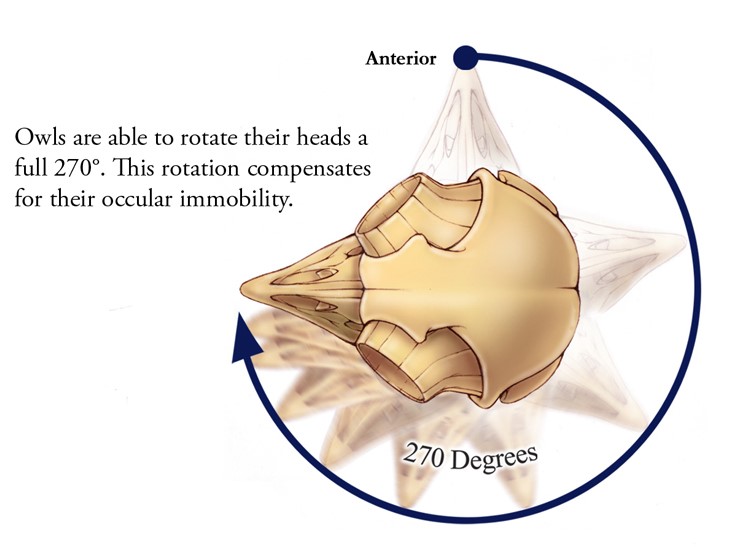 This myth is closer to true than most on this list, but is still misleading. While owls cannot rotate their heads in a full circle, they do come close: these birds can rotate their heads an impressive 270° in either direction (see figure below). That’s the equivalent of turning your head to the right and looking out over your left shoulder. While this flexibility in rotation may seem incredible to humans, owls are limited by another type of movement that we take for granted: the ability to move our eyes. Owls’ eyes are so large in their skulls that most have lost most of the musculature needed to rotate their eyes within their sockets. That means to look at something to their right, owls need to turn their head to see it. Research conducted at Johns Hopkins University has uncovered some of the amazing adaptations that allow owls this extreme range of motion; a 270° twist in a human neck would cause decapitation! There are changes in owls’ vertebrae structure as well as the arteries running through the neck that help prevent damage from occurring when these raptors turn their heads [1].