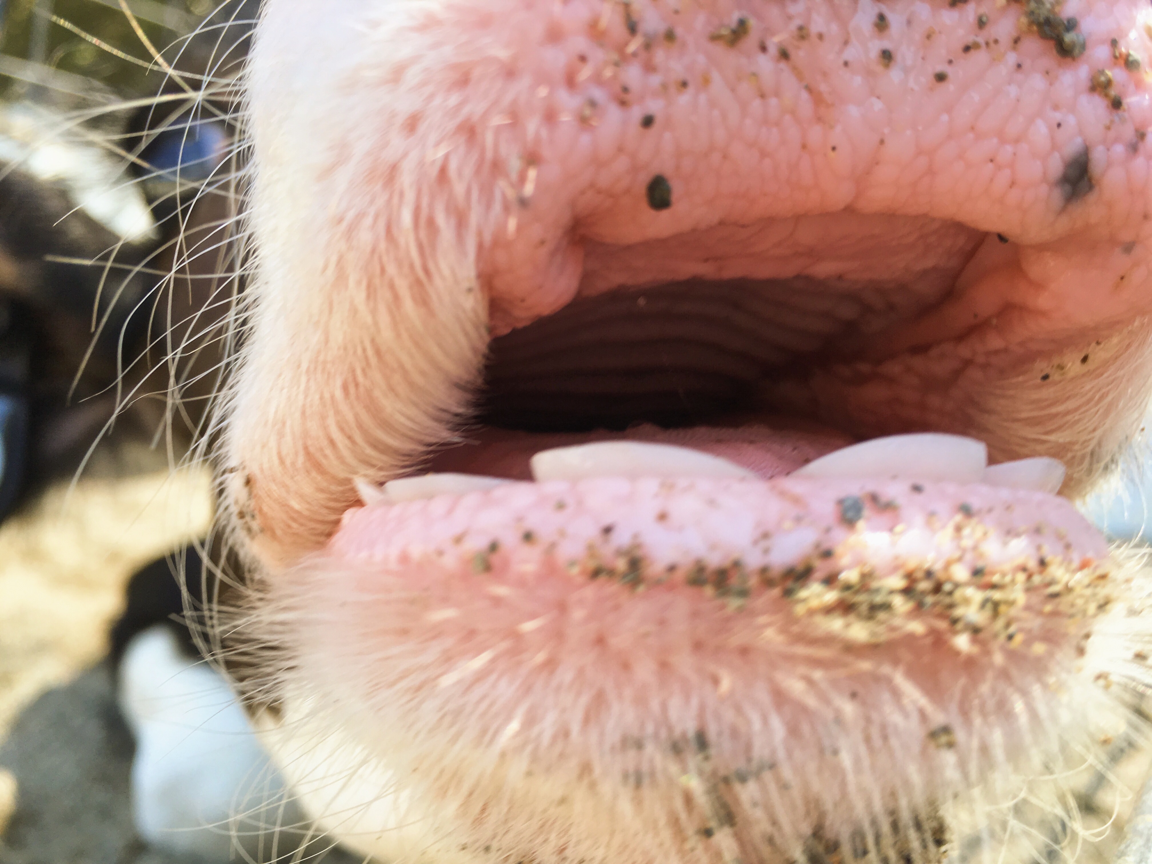 Cattle don’t have upper incisors, so they chew by grinding feed between their bottom teeth and tough upper dental pad. This calf was born with her milk teeth (“baby teeth”) which will eventually be replaced by permanent incisors as she ages. As of yet, no research has demonstrated evidence of a cow tooth fairy…