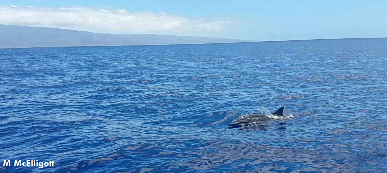 Hawaiian spinner dolphins (Stenella longirostris) are a small species of dolphin found throughout the Hawaiian island chain (Norris et al., 1994). At night these social animals forage on fish, shrimp, and squid in the waters along the sloping volcanic coastlines (Benoit-Bird et al., 2001; 2003). During the day spinner dolphins return to nearshore waters, often moving into shallow and calm bays, to rest (Norris et al., 1994). Dolphin “sleep” looks very different from our sleep; resting dolphins form small, tightly-spaced groups that swim slowly and in synchrony. They don’t snuggle up to slumber on the ocean floor because they have to (1) go to the surface to breath, and (2) keep an eye out for hungry tiger sharks.
