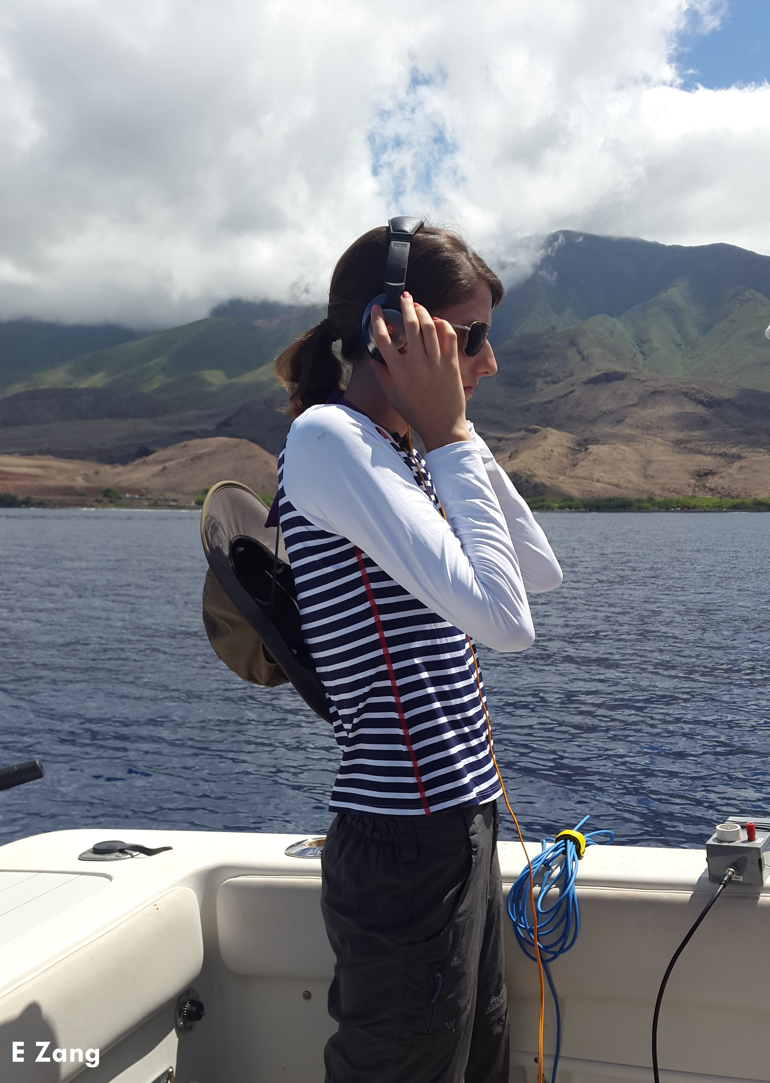 In order to determine when and where spinner dolphins rest, I use a combination of vessel surveys and passive acoustic monitoring. As part of my master’s thesis I spent two weeks during the summers of 2016 and 2017 on Maui conducting vessel surveys with my advisor, Dr. Marc Lammers, the research coordinator for the Hawaiian Islands Humpback Whale National Marine Sanctuary. We started out of Lahaina Harbor in West Maui around 9:00 am and zig-zagged between Maui and Lanai scanning the waves for shiny dorsal fins breaking the surface. When we found dolphins, we monitored the pod (group of dolphins) from a distance for as long as possible, noting their group size, location, behavior (milling, traveling quickly, or jumping out of the water), and sea-state which indicates how rough the water is and therefore, how well we could see dolphins. Estimating group size is a skill that develops with experience; rough approximations are made by assuming that the number of animals seen at the surface at any given time represent about one quarter of the total pod. We’d often stay with the dolphins until around 5:00 pm as they rounded the bottom of Lanai and headed for deeper waters.
