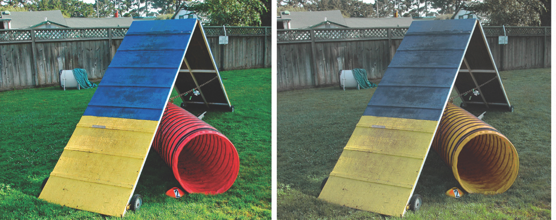 To debunk this common myth, we once again need to look at the sensory system of the animal in question. But first, it may be helpful to understand the physiology of human sight. Our eyes contain cells that help us detect light and color: rods and cones, respectively. While rods help us distinguish light levels and contrast, the type and number of cones an organism possesses inform what colors that organism can detect. Most humans are trichromatic; we have three cones which peak in the red, blue, and green wavelengths. In comparison, dogs (as well as cats, horses, and some colorblind humans) have only two cones. These so-called “dichromats” often have trouble distinguishing between reds and greens. Importantly though, this also tells us that dogs do see in color – they just see it differently than us (see the figure above). Additionally, there is a lot more to vision than just color detection; you can learn more about visual resolution and acuity here.