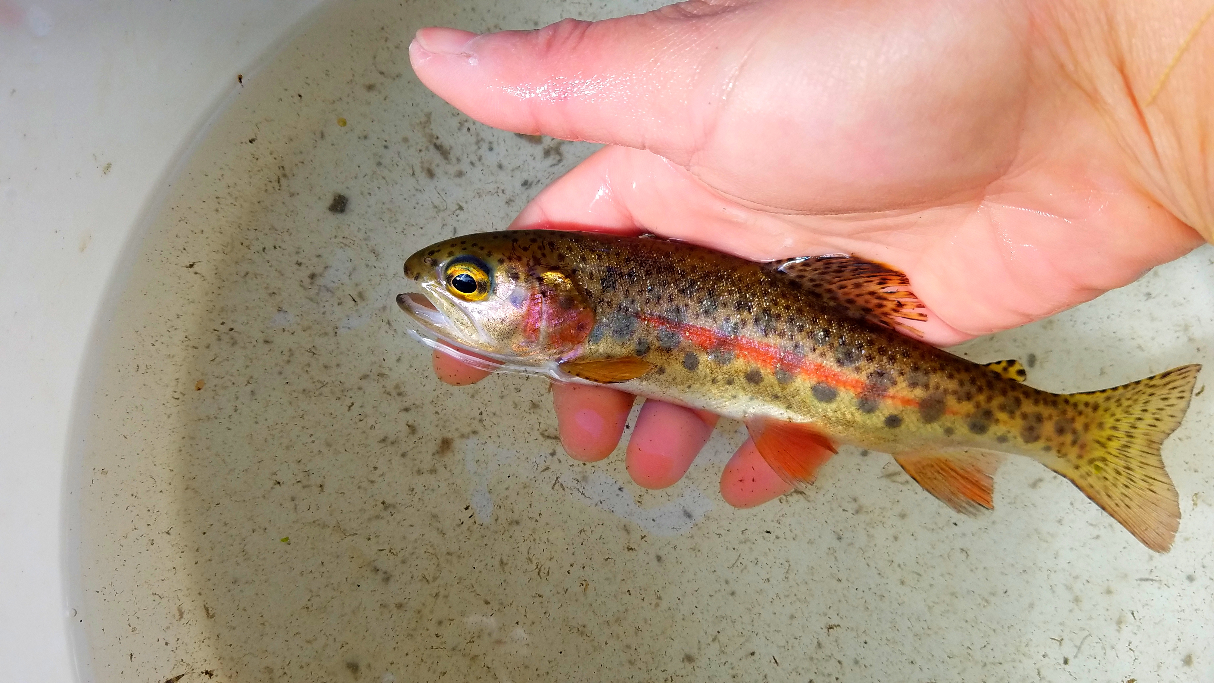 Although there was no definitive trail to our site, our handheld GPS offered navigational and mental ease to help us find our backcountry site. We began surveying shortly after our arrival, eager to tag 300 rainbow trout. It was a rough start. Besides losing my water bottle (yeah, I really regret not bringing the second one), we caught a fair share of non-targeted bass and sucker species. For the purpose of our study, we were not interested in collecting data on these species. However, we rejoiced every so often exclaiming, “RAINBOW!!” whenever we were fortunate enough to land our target species in our nets.