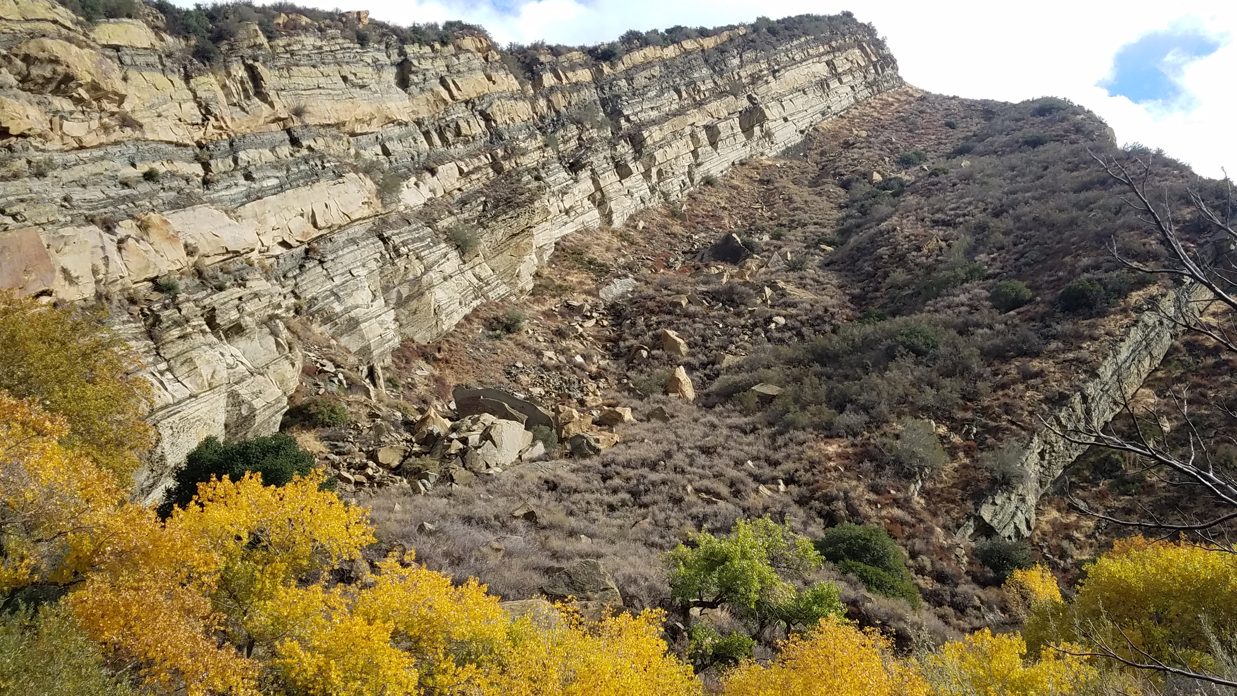 After a brief five-minute drive from the interstate, we arrived at the trailhead leading to our field site. While most of our Central Valley field sites are located in flat, rural areas with a large agricultural presence, I was immediately taken aback by what this new landscape offered. The small creek meandered through a deep canyon composed of layered sedimentary rocks. With cottonwoods lined up along the riparian corridor, flaunting their vibrant yellow leaves undergoing senescence, how could we possibly be close to Los Angeles?!