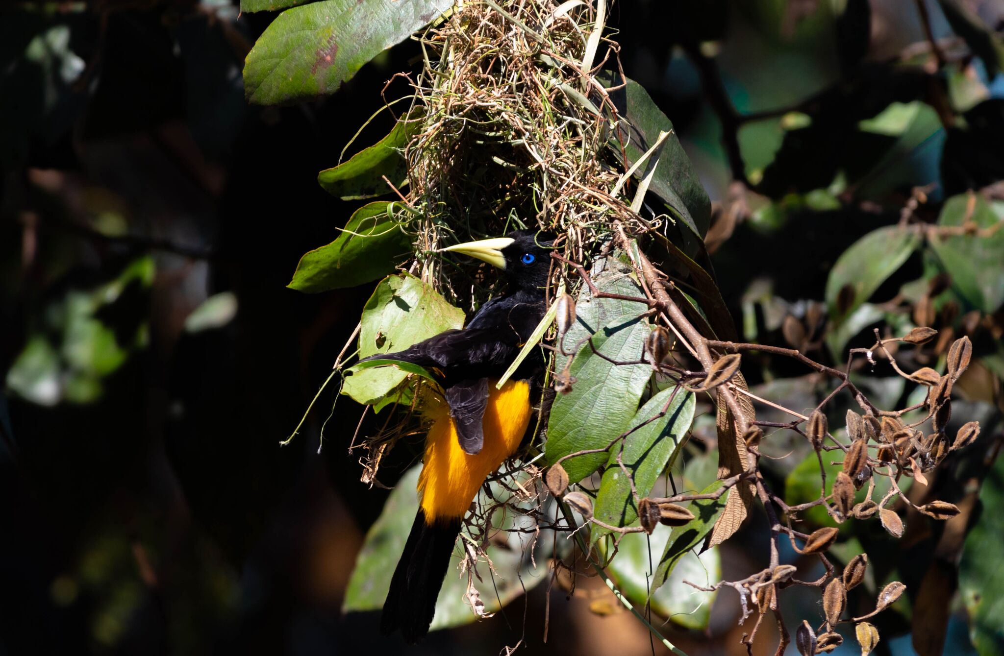 Female yellow-rumped caciques (Cacicus cela) choose to build their unique, enclosed, hanging nests next to wasp nests to provide protection from mammals and botflies.
