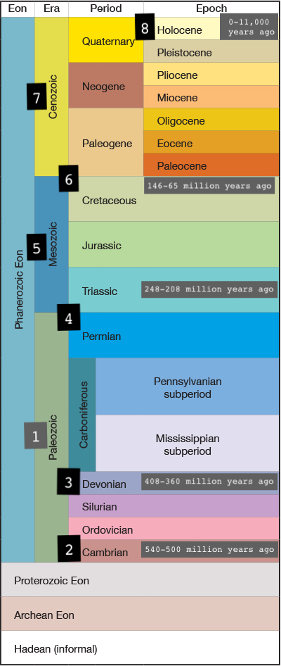 Figure 1: Geological time figure, adapted from the International Stratigraphic Chart, 2015. The oldest eras begin at the bottom and the newest are at the top. The numbers on the figure correspond to the numbers within the main body text. All sentences in bold highlight time periods relevant to the horseshoe crab. [Source]
