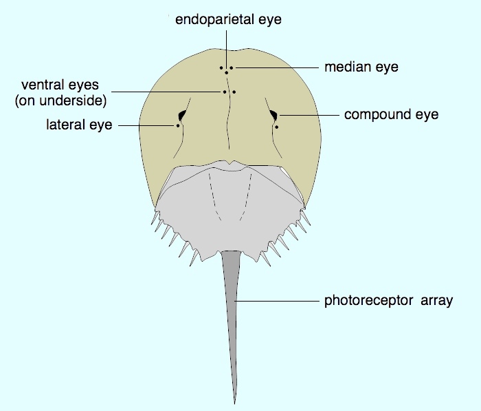 In addition to having specialized appendages, and efficient, two-for-one functional body parts, this critter has an extensive vision system, that has very different functions from our own! Although we might initially notice the two compound lateral eyes that give them a human-like, furrowed-brow look, there are an additional 5 eyes on the dorsal (top) side of the prosoma! These compound eyes don’t have high resolution (i.e. can’t see objects very clearly) but can perceive a wide angle and have the ability to track fast-moving objects. The two median eyes, the endoparietal eye, and rudimentary lateral eyes are used for light sensitivity and processing ultraviolet light. But wait, there’s more! In addition to the 7 eyes on the shell, there are also a series of photoreceptors (i.e. light sensors) on the telson that helps the horseshoe crab maintain a circadian rhythm (i.e. day and night cycles), as well as two ventral eyes located near the mouth to assist in swimming and perhaps hunting efficiency. Why so many eyes, you ask? In addition to helping with hunting and food processing, horseshoe crabs rely on changes in daylight to trigger migrations from wintering grounds along the continental shelf (6m-20m) to the coastal shallows for breeding. These migrations occur usually on evenings of new and full moon tides in the early summer, meaning that light is so important to their reproduction that they evolved special eyes to detect event the smallest changes in light [3].