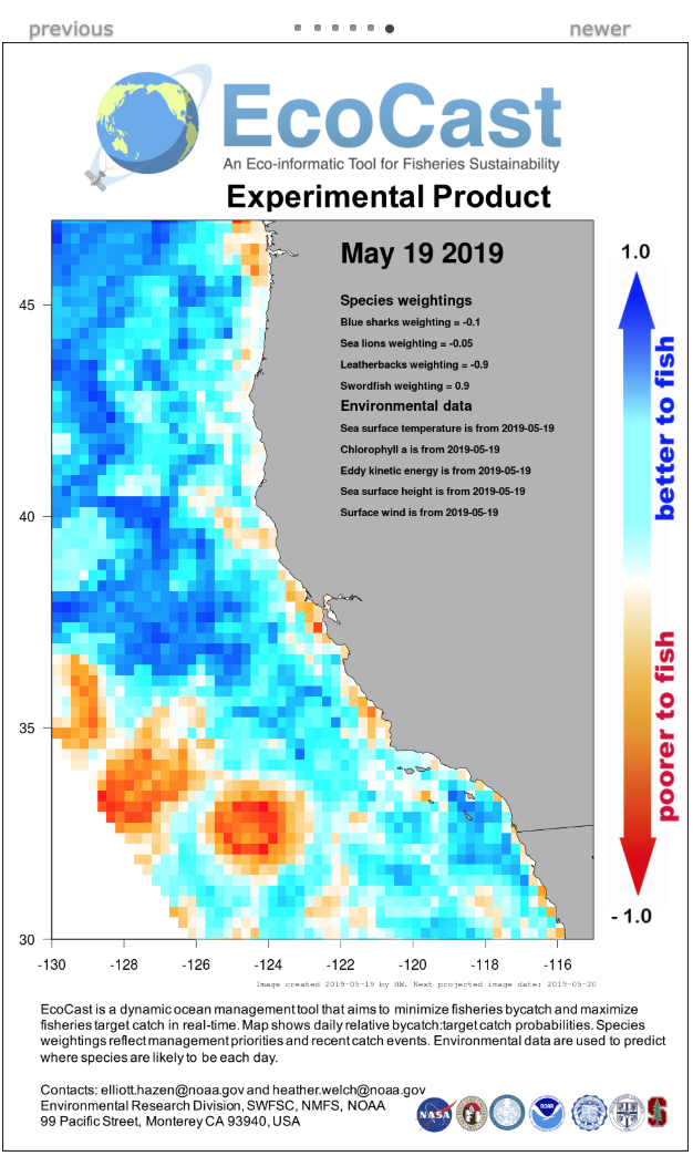 Many marine environments, like the open ocean, are considered “data poor” compared to the better-studied land and coastal environments. This means that habitats that would best protect species can be difficult to identify. Here is where information on animal movement can be most beneficial. In telling us where and when animals are likely to be found (and therefore what threats they are more likely to face), this data allows us to direct our protective efforts to the places where they may be needed most (see the “EcoCast” tool above). While this is certainly important in the present, it will be critical to monitor movement patterns to assess whether our efforts will remain effective in the future. For example, if we begin to observe migratory animals moving north gradually each year, perhaps the best management strategy would be to work on establishing protected areas where we predict the animals are likely to be. A related strategy has been proposed in which protected areas are established along the animal’s entire movement path, but regulations are only enforced during times of year when the animal known (or predicted) to be there. These “mobile” MPAs, as well as other dynamic (versus static) management approaches, will require that we determine if the animal will continue to exhibit large movement patterns into the future.