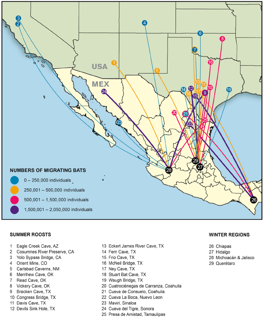 - Wiederholt, R., López-Hoffman, L., Cline, J., Medellín, R. A., Cryan, P., Russell, A., … & Semmens, D. (2013). Moving across the border: modeling migratory bat populations. Ecosphere, 4(9), 1-16. https://esajournals.onlinelibrary.wiley.com/doi/10.1890/ES13-00023.1