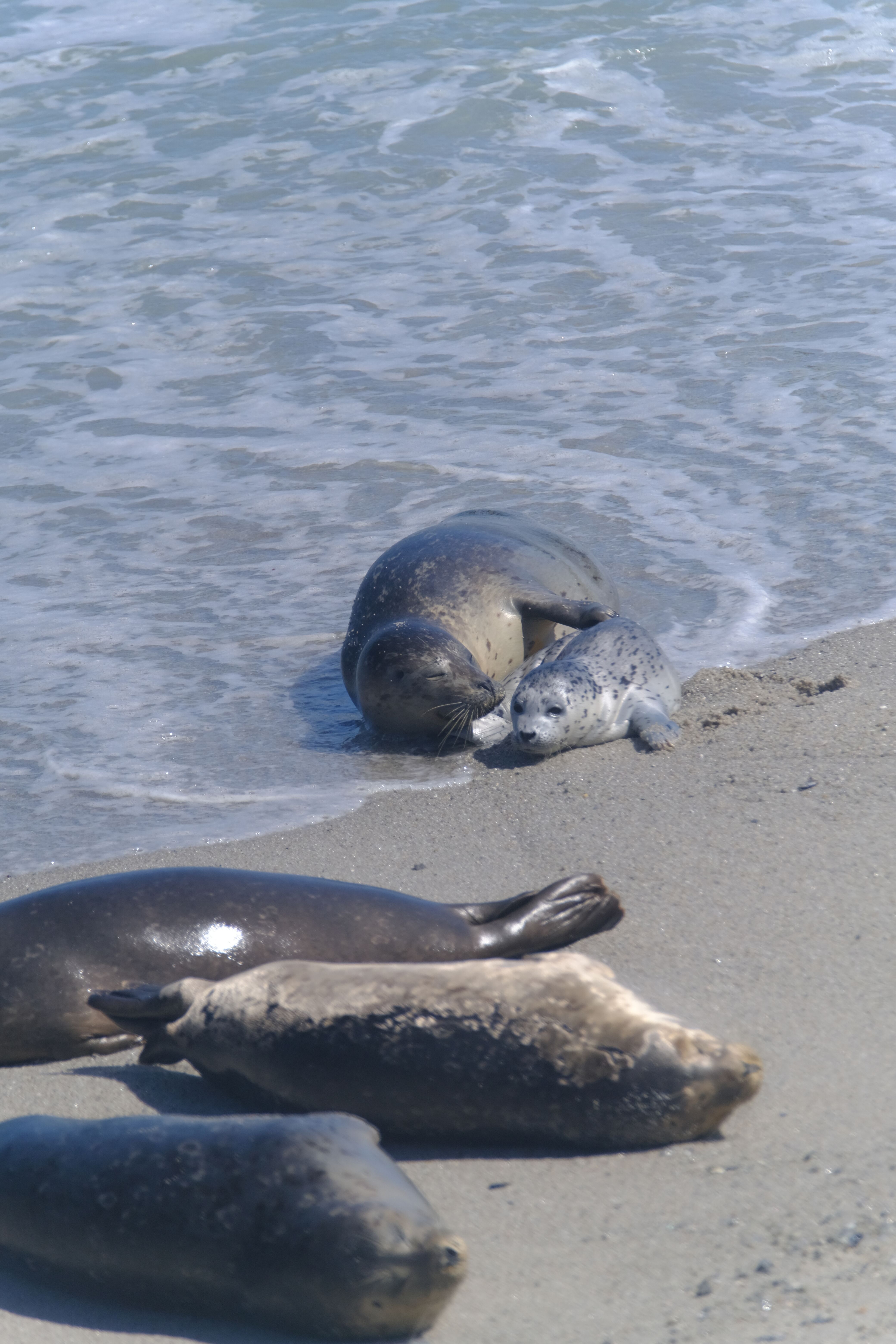 Dorm life (a.k.a beach time) for harbor seal pups also teaches important lessons. In the first 6 days after birth, harbor seal pups spend about 40% of their time in the sea [3]. The 60% of time they spend on land, their moms may or may not be with them (remember, mom has to go eat something to maintain energy stores for both her and her pup). Thus, pups must learn to understand the tide patterns so that they can move up the beach to prevent getting swept away while their mom is out grabbing a snack. An issue with this latch-key kid strategy is that many human beachgoers see a “lonely, helpless” pup on the beach and are tempted to rescue it. What they don’t notice is that mom is usually never far off the coast, and even the sight of humans can spook her and keep her away from her pup. Thus, it is important to always observe the cuteness of any seal or sea lion from a distance of one football field so that moms and pups can be reunited. If you a California beach goer and are concerned that a pup is truly alone, call The Marine Mammal Center, The Pacific Marine Mammal Center, or California Wildlife Center. These are trained rescue and rehabilitation teams that can assess, monitor, rescue, and rehabilitate pups, should they need intervention.