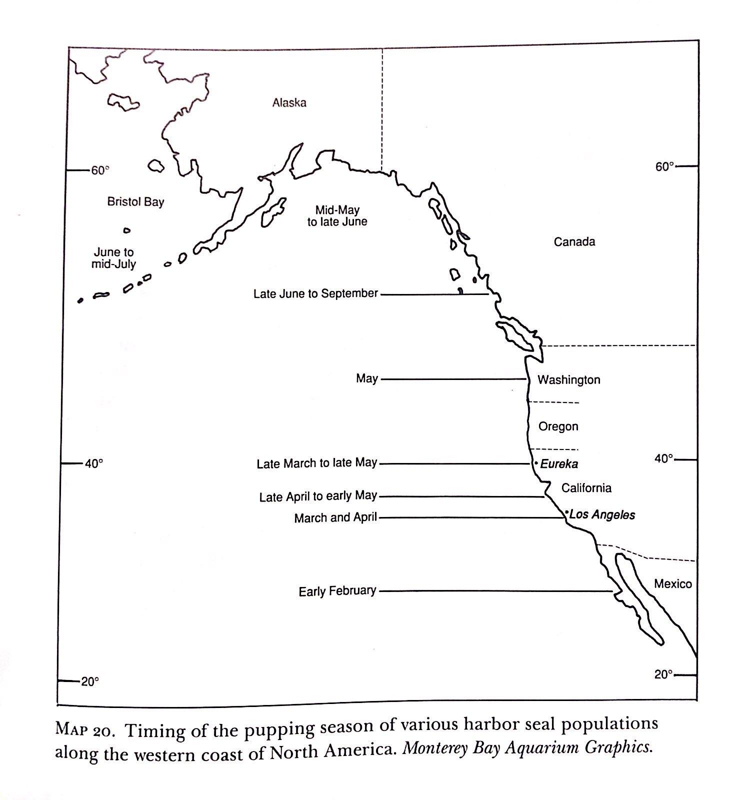 Despite the fact that Eastern Pacific harbor seals are non-migratory (individuals stay within the same home range), they can be found all along the coast of North America— from Baja California all the way up to the Pribilof Islands in Alaska. They are solitary animals, only seen in proximity of each other on the beach, yet females have the ability to coordinate their pupping season each year. Not only do they coordinate pupping, but their wide range in latitude means that where moms are dictates when pups are born; for harbor seals down in Baja, pupping season starts in February while up in Alaska pups are born in July (see figure below). This reproductive phenomenon is due to delayed implantation; once a female’s egg is fertilized, it pauses development for 1.5 to 3 months and then resumes gestation [1]. Delayed implantation is beneficial for females who have an eleven month gestation, as it gives them a physiological break between nursing a pup and developing a new fetus, as well as allows her enough energy to molt. Delayed implantation is also beneficial for pups to be born during optimal times of year when the upwelling of nutrients is common. It is also an efficient way for adult males to coordinate mating with females so they can resume their solitary lifestyle.