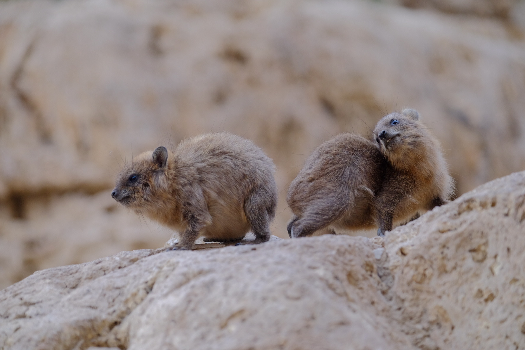 Rock hyraxes (Procavia capensis) may look like grumpy rodents with fangs, but did you know they are actually the closest land relative to elephants? Using fossil, morphological, neuronal, and molecular data, scientists have put rock hyraxes in the same clade (Paenungulata) as elephants and manatees. Hyraxes and elephants have similar foot structures and skulls, so in fact those little fangs are actually tusks!
