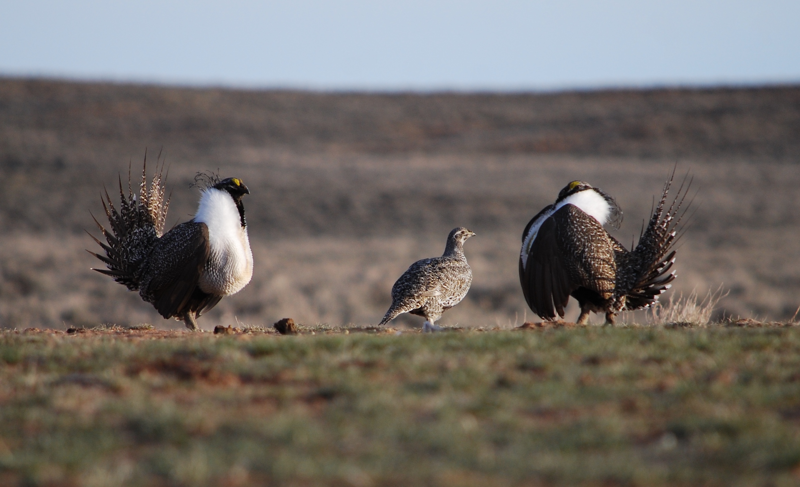 A female sage-grouse (center bird) evaluates two sage-grouse males (the rightmost male has been caught mid-display, while the leftmost male is shown pausing between consecutive “strut” displays).