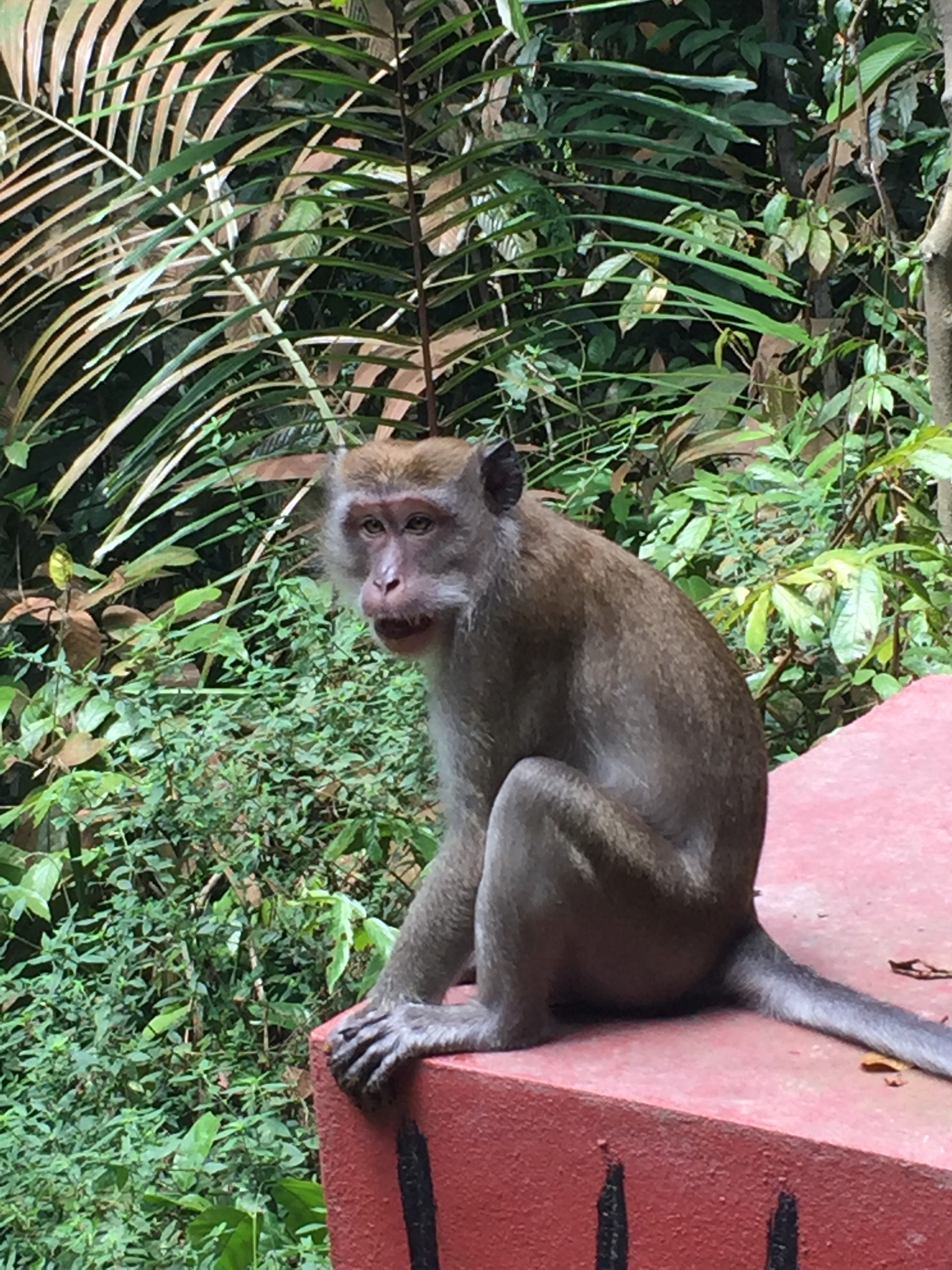 This lone male clearly wants to range alone as he is trying to scare us off by displaying aggressive behaviors. Aggression in macaques, and in this example long-tailed macaques (Macaca fascicularis), can be identified via the intense direct stare, raised eyebrows and round “open threat face”.