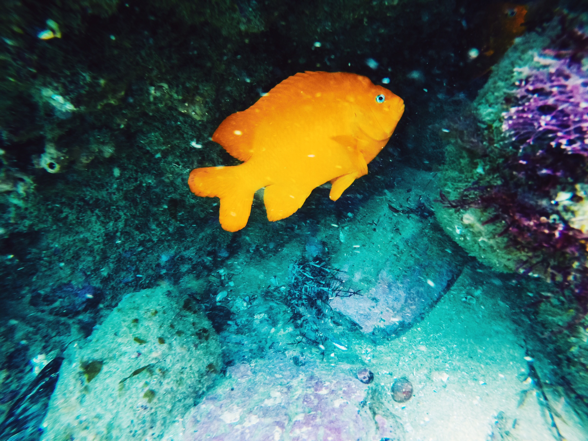 Garibaldi (Hypsypops rubicundus) are territorial fish. Males will clear bottom territories and combat other fish and even SCUBA divers that come too close to their territory. However, it is uncommon that there is intraspecfic aggression; Garibaldis generally “respect” each other’s territories, so there is no need for aggression within species.