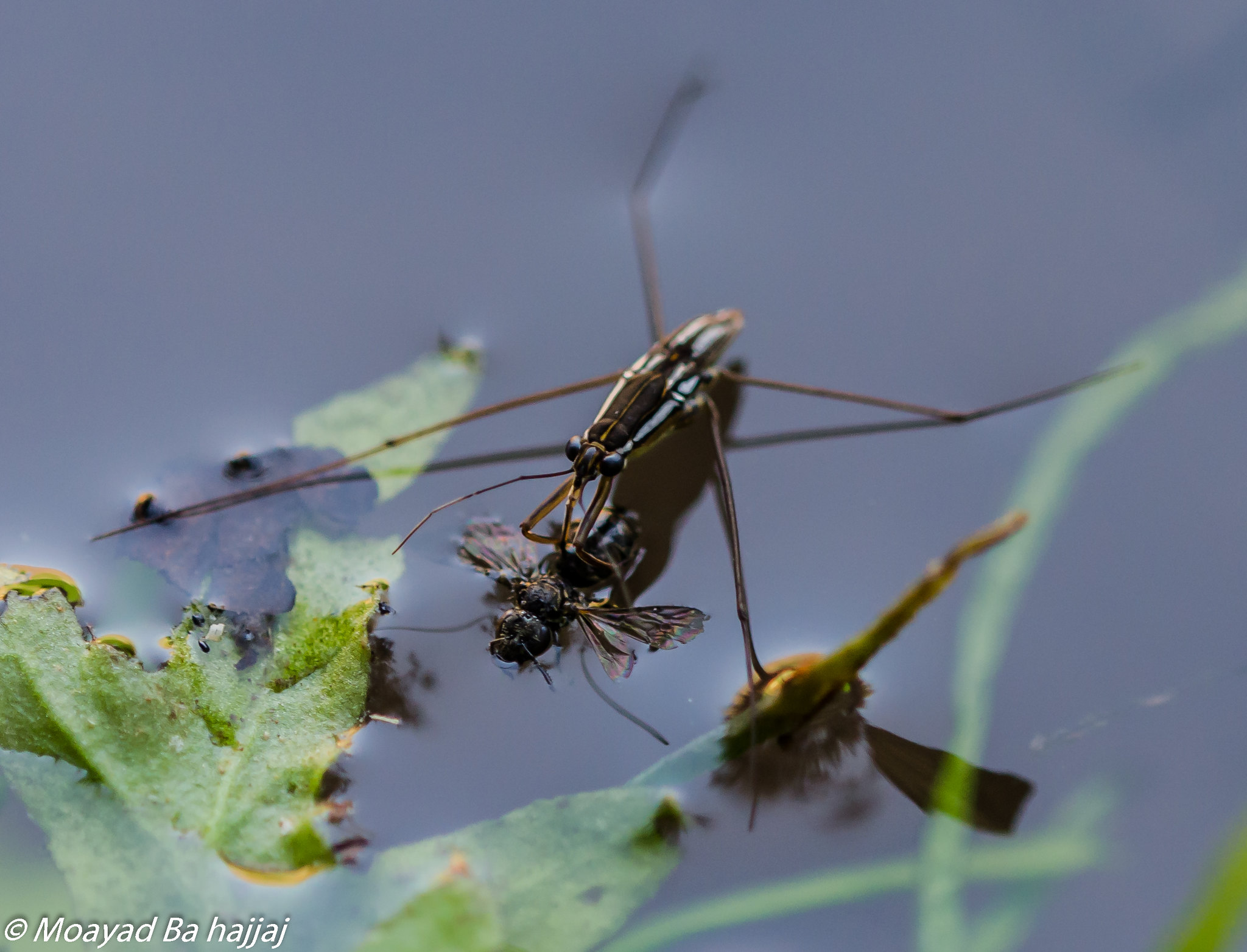 A water strider skating on the surface of a pond. Source