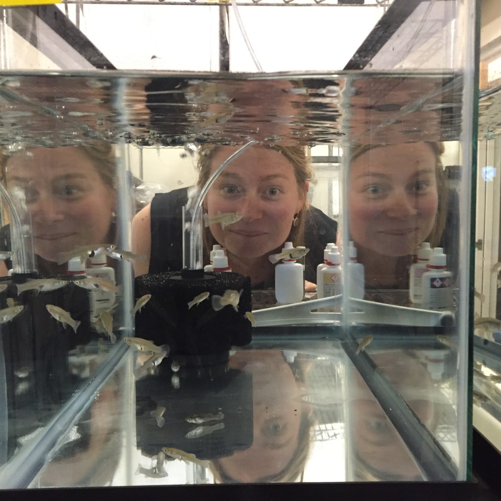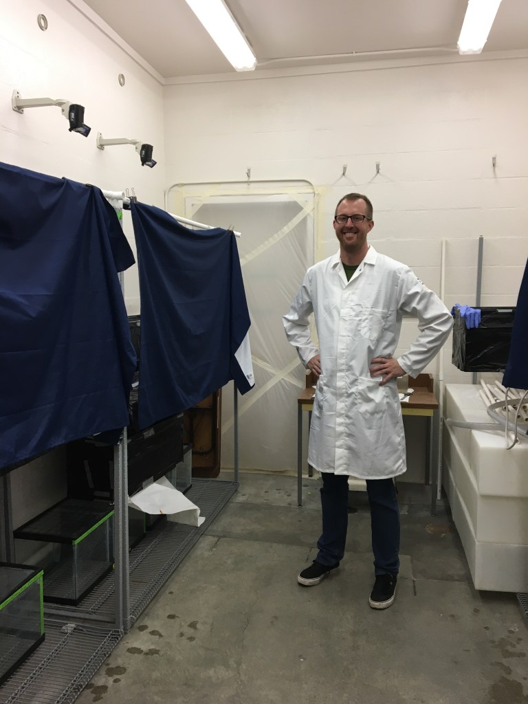All of that is why I found myself in the lab wearing a full lab coat, safety glasses and gloves, along with a dedicated team of undergraduate research assistants. It turns out that when you are working with potentially harmful pesticides, studying fish feels a lot less like kindergarten. Isaac and I divided female fish into groups of five in large pickle jars (fun fact–the silicon sealant in normal aquariums contains chemicals which can react with the pesticides!) After two weeks with their new social groups, each fish went through a series of baseline behavior assays- meaning we looked at their behaviors under their usual environmental conditions. This allowed us to determine how they behaved before being exposed to pesticides. Each lovely lady fish was first exposed to two males—one big, sexy guy and one smaller, less attractive one—and we compared the time that she spent with each one. Then we gave her access to a group of unknown females and recorded how active she was and how much time she spent in a group. We then exposed the groups to different amounts of the pesticide and retested the same behaviors two weeks later.