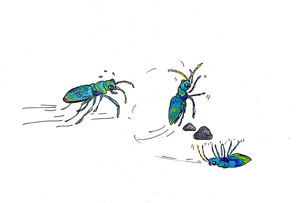 Watch out! Tiger beetles run so fast that they temporarily go blind. To avoid tripping hazards (and find prey!) they run in short bursts, taking breaks to orient.