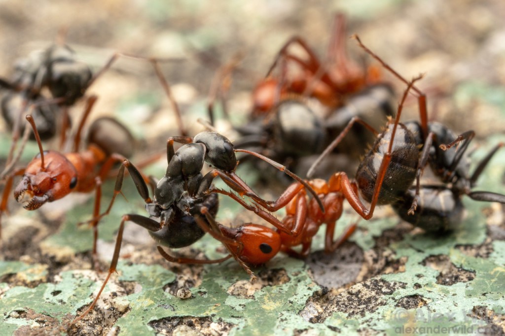Main featured image: A Polyergus mexicanus slave-making ant carries away a brood member from its Formica host colony. [Photo taken by Alex Wild, Source]