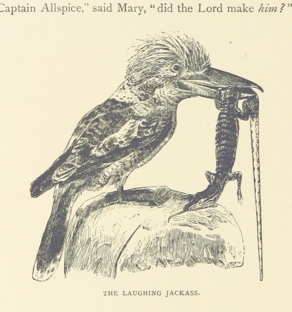 Laughing kookaburras have long caught the attention of humans with their wicked and distinct laughing call. This unnerving sound, most prominently produced at dawn and dusk, was the impetuous for a whole host of nicknames given to them by European settlers: “alarm bird”, “breakfast bird”, “settler’s clock”, “bushman’s clock”, “laughing jackass”, and “ha ha pigeon”. When introduced to the western coast of Australia in the late 1800s, their reputation for killing chickens, ducklings, and the chicks of wild birds led to more negative characterizations such as “the laughing demon” and “a bird of evil” [1,2].
