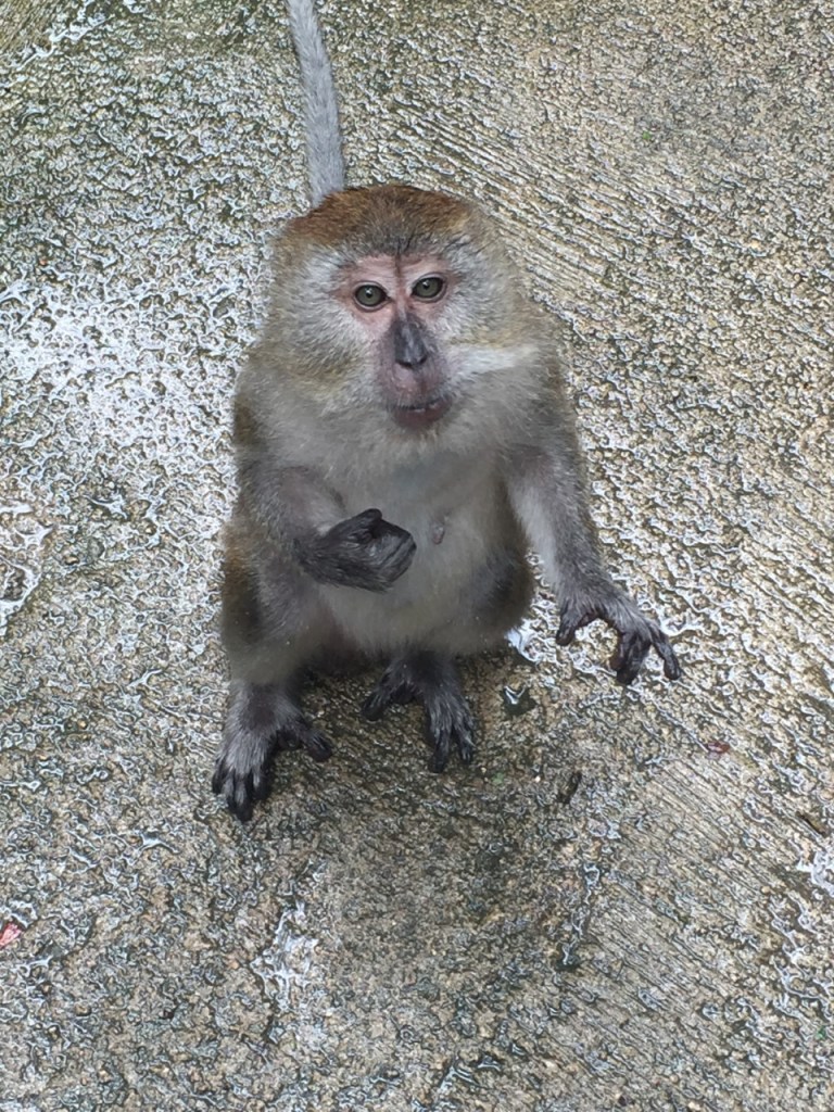 Ever had your pet beg to you for food? Well this is no different. This is Emma, performing her signature “hands out” behavior to indicate that she would like you to share whatever scrumptious things you have with her. Emma is a long tailed macaque that lives in a tourist park outside of Kuala Lumpur, Malaysia. She is one of the subjects in my dissertation study, which investigates how monkeys adapt to urban areas.