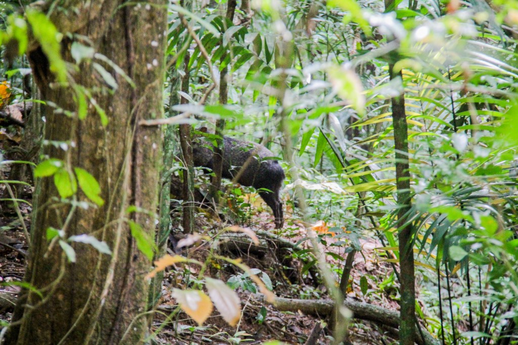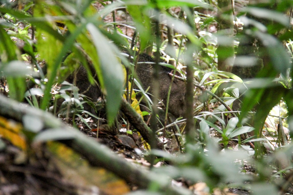 Alexander is spending Christmas on Barro Colorado Island in Panama, part of the Smithsonian Tropical Research Institute. The island is quiet for the holiday: only him, a handful of guardabosques (“Forest Guards”, similar to game wardens, that help maintain and protect the Barro Colorado National Monument), and a few cooks. They had a special lunch, featuring a potato salad made with beets, that is a common festive treat in Panama, and fruit cake traditionally made with rum. During his hike this afternoon, he heard a collared peccary (Tayassu tujacu) and decided to follow it. It took an hour and a half to sneak close enough for a good photo, but he got a few!