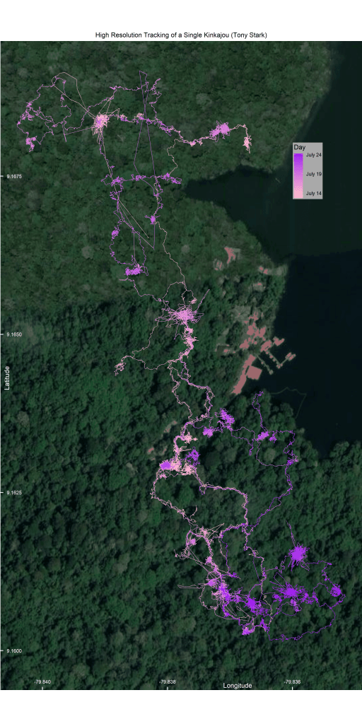 The animal I study (the kinkajou, Potos flavus) is arboreal and nocturnal. This means that to watch one, I have to run through the Panamanian rainforest at night. While looking up.