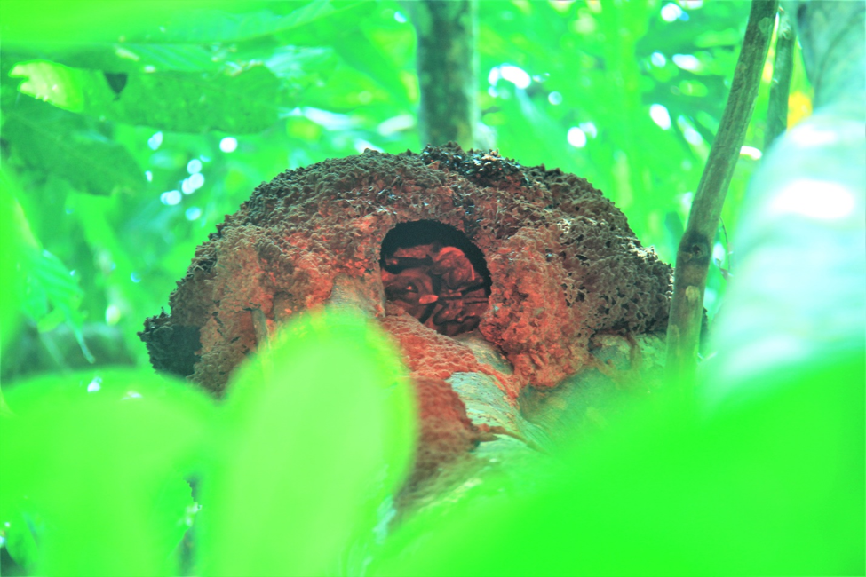 I circled around the tree with the termite nest and found a small opening at the bottom. I clicked on my high-beam red light and there was our bat, huddled up amongst several of a smaller bat species, Lophostoma silvicolum. The lack of a female colony was disappointing, but we were still witnessing an interesting behavior. P. hastatus roosts have been observed in caves, tree hollows, palm leaves, and human structures, but Barro Colorado Island, where we were working, is the only place individuals have been described living in termite mounds with L. silvicolum [2, 3]. Along with descriptions of male P. hastatus roosting alone or with other species in Brazil [2], this behavior suggests that the social organization of P. hastatus is far more flexible than once thought.