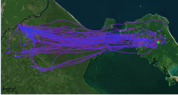 Recent research conducted by the lab of Camila’s adviser, Dr. Dina Dechmann, and Dr. Teague O’Mara in Bocas Del Toro, Panamá revealed a previously unknown foraging behavior of P. hastatus. Remarkably, the bats they tracked flew over twenty kilometers every day to forage at balsa trees (Ochroma pyramidale). Balsa trees produce an abundance of nectar-rich flowers from the months of December through February when food is often scarce [7]. The bats’ long-distance flights clearly indicate these flowers are an important resource for P. hastatus in Bocas Del Toro. Because group foraging is most beneficial when resources are highly concentrated and widely dispersed, like the balsa, this system has a lot of potential to reveal more about the social dynamics of group foraging. Camila and Dr. Dechmann are working together to learn whether group foraging occurs more when balsa flowers are in season, whether group foraging is reduced when balsa are more abundant and less patchy (like on Barro Colorado Island), and whether individual relationships are important for the reciprocal exchange of information.