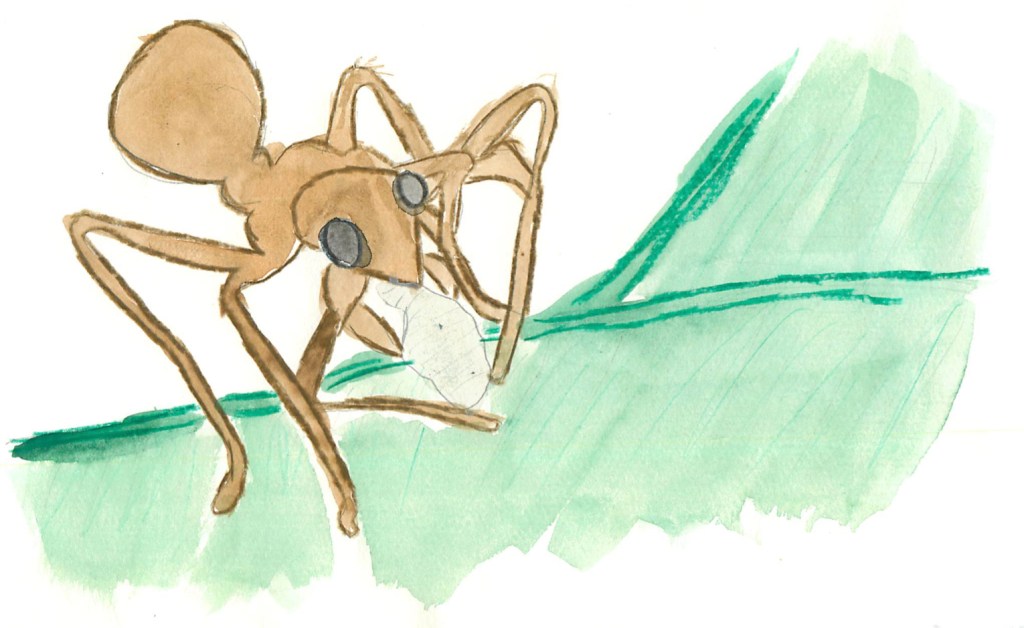 Like almost all activities in a social insect colony, nest building involves team work. Weaver ants, Camponotus (Myrmobrachys) senex, build elaborate nests made of stitched together leaves that are subdivided into small interconnected chambers. The work of tying these leaves together involves a surprising joint effort by both adults workers and larvae. Adult workers will carry individual larva in their mandibles and stimulate the larva with their antennae to elicit the production of silk from the larva to connect to leaf sections together. Essentially, the adult workers use their developing siblings as little glue guns to build their nests!