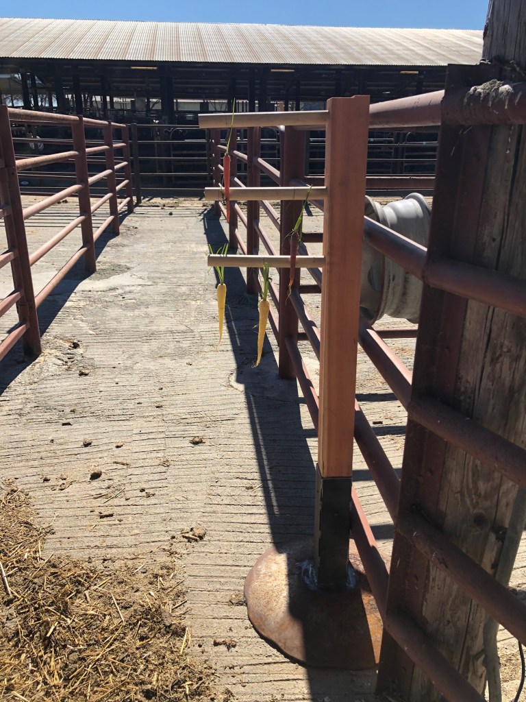 The first novel object I tried to use was carrots. I put the carrots in a feed pan, and some of the cows approached slowly and cautiously to the feed pan, while others kicked at it as they ran past. I was excited! Yes, my first novel object succeeded to produce different and distinct reactions in the cows! But wait: what if they were reacting to just the feed pan and not the carrots? I put the carrots directly onto the ground and they trampled right over them without even noticing. Ugh. So, naturally, I designed a big, complex “tree” that consisted of a large post and “branches” (aka wooden rods) sticking out of the middle of it. I took the design to our wonderful animal science farm crew (shout-out!) that brought my design to life! I hung multi-colored carrots on the branches and anticipated the cow’s reactions. I got absolutely nothing from them, not even a glance! They ran right past it without a hesitation in their hooves. But, I had gathered some information: a response to something on the ground > a response to something at eye-sight. What about an artificial bush or flowers? I chose plants they would never come across while on range (big, colorful flowers and ferns), but that still are relevant to them as herbivores. And it worked! Just like the feed pan, some of them sniffed and some of them ran and kicked.