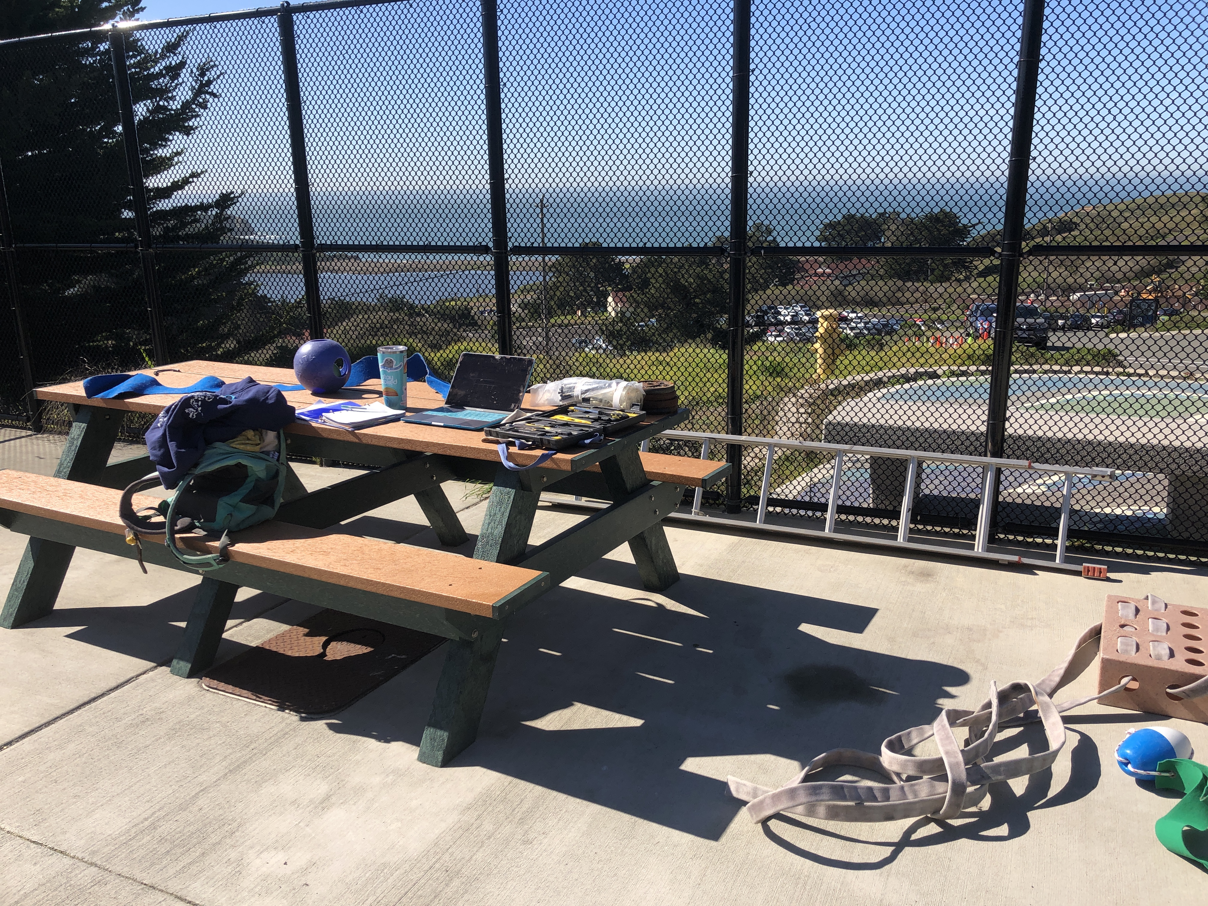 Not all field logisitcs are a headache, especially when you get to prep with a view of the ocean and get every enrichment stimulus organized and accounted for. [Credit: Karli Chudeau].