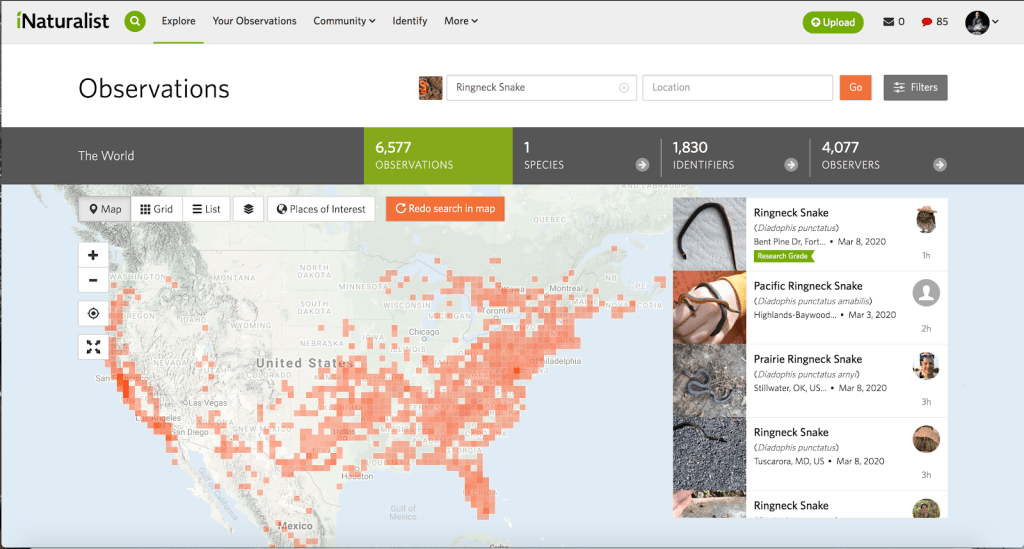 Much like humans sloughing off skin cells on a daily basis, reptiles also routinely shed their skin, a process called ecdysis. Unlike us, snakes typically do this in one go. Ecdysis allows snakes and other reptiles to continue growing and remove parasites that latch onto their body. Snakes on the brink of shedding may be extra crabby; herpetologists refer to individuals in this state as being “in the blue” or “in the grey”. This is because snakes lack eyelids and instead possess a single scale that covers their eye, which begins to push away from the eye as a snake prepares to shed. When this happens, the snake’s eye has a blue or grey appearance and its vision is impaired. With limited vision, the animals can be feistier than normal and, though usually docile, they may be more keen to strike. Although we should always be cautious and keep our distance around wild animals, snakes “in the blue” should be given an extra wide berth. As mentioned earlier, ringneck snakes are rather reclusive and shy, often hiding during the day in their forest, grassland, and marsh habitats. It can be challenging for researchers to study cryptic species such as ringnecks because it is difficult to accurately map their distribution and gather basic information about their behavior. One solution to this problem is citizen science! Platforms such as iNaturalist, one of the largest citizen science projects in the world, allow anyone—from students to casual nature lovers to urban bird watchers—to record and get help identifying plants and animals they encounter in the wild. Citizen scientists have logged over 6,000 sightings of ringneck snakes on iNaturalist. You can download the iNaturalist app on your smart phone and begin logging your own encounters with wildlife!