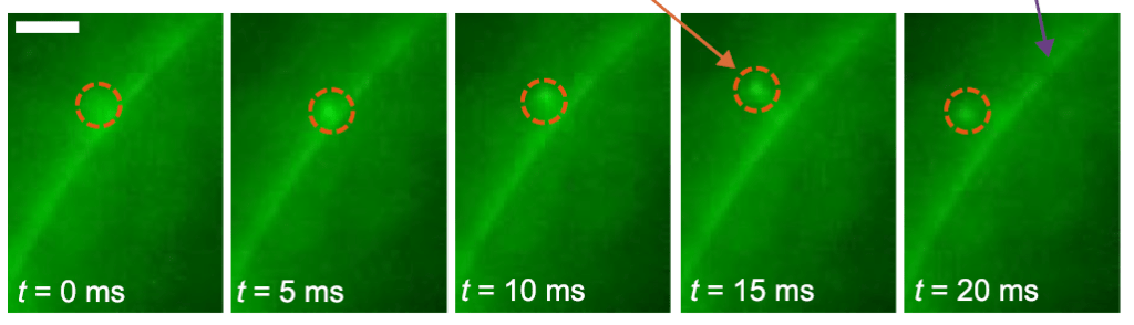 In addition, they developed a device which allowed them to experiment with how “unlocked” the synthetic membranes were to USCNT. USCNT’s were sent through a small tunnel of water toward a synthetic membrane, and they looked for them to pass through on the other side. The team used images from a fluorescence microscope (pictured below) and electrical conductance to see if the USCNT passed through. In their experiments, the synthetic membrane with no cholesterol blocked the USCNT’s from passing through as it was “locked.” When the membrane had cholesterol, it was “unlocked” as USCNT’s passed through it. Furthermore, the team measured an electrical current in the tunnel when the USCNT’s passed through. So, the tubes had entered the membrane, made a hole to let the tunnel conduct electricity, and then passed through to the other side! This whole process occurred in a very fast time span (~5 milliseconds)!