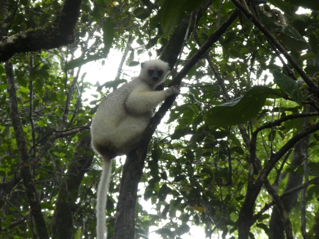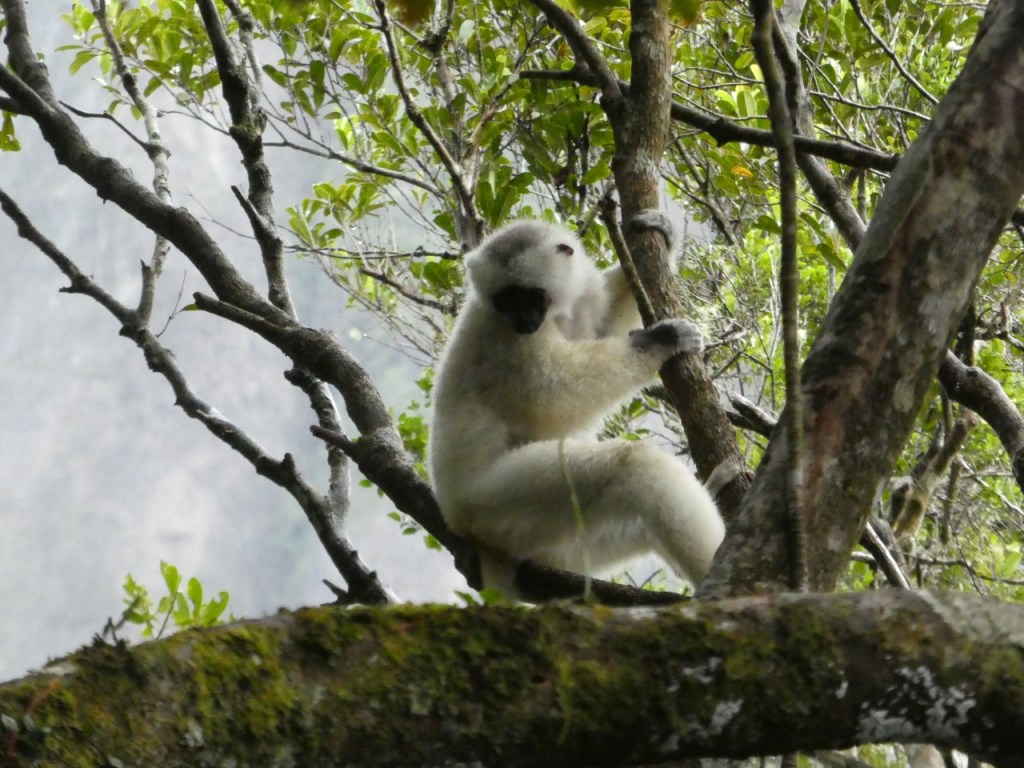 Silky sifaka (Propithecus candidus) are among the worlds most endangered primates, with less than 1000 remaining in the wild. Native to the steep, mountainous rainforests of northeastern Madagascar, silkies, as they are often called, make ‘zzuss’ vocializations. Sounding like a combination of a sneeze, a lip smack, and sifaka, these calls act as both alarm calls and to help group members maintain contact with each other.