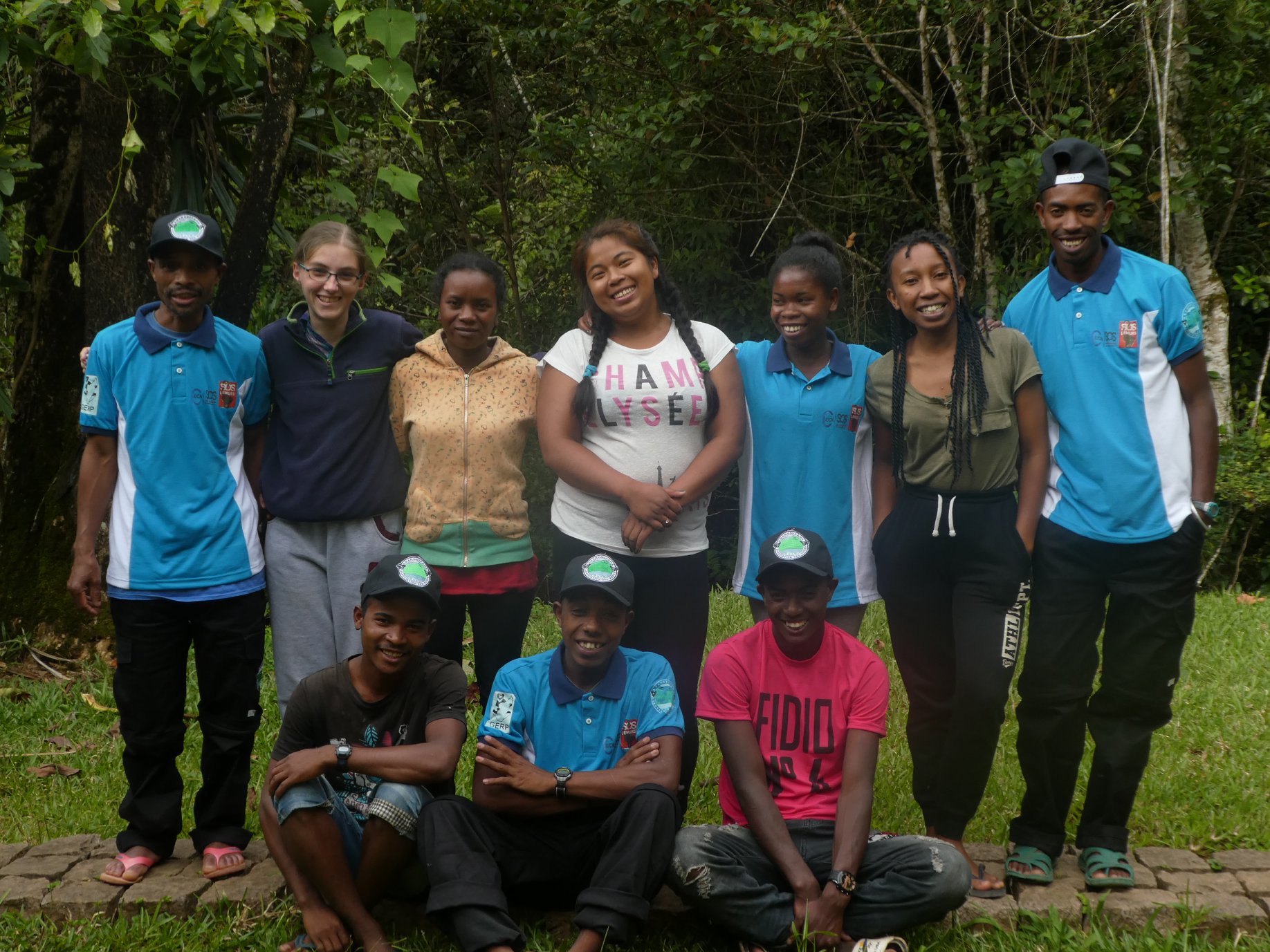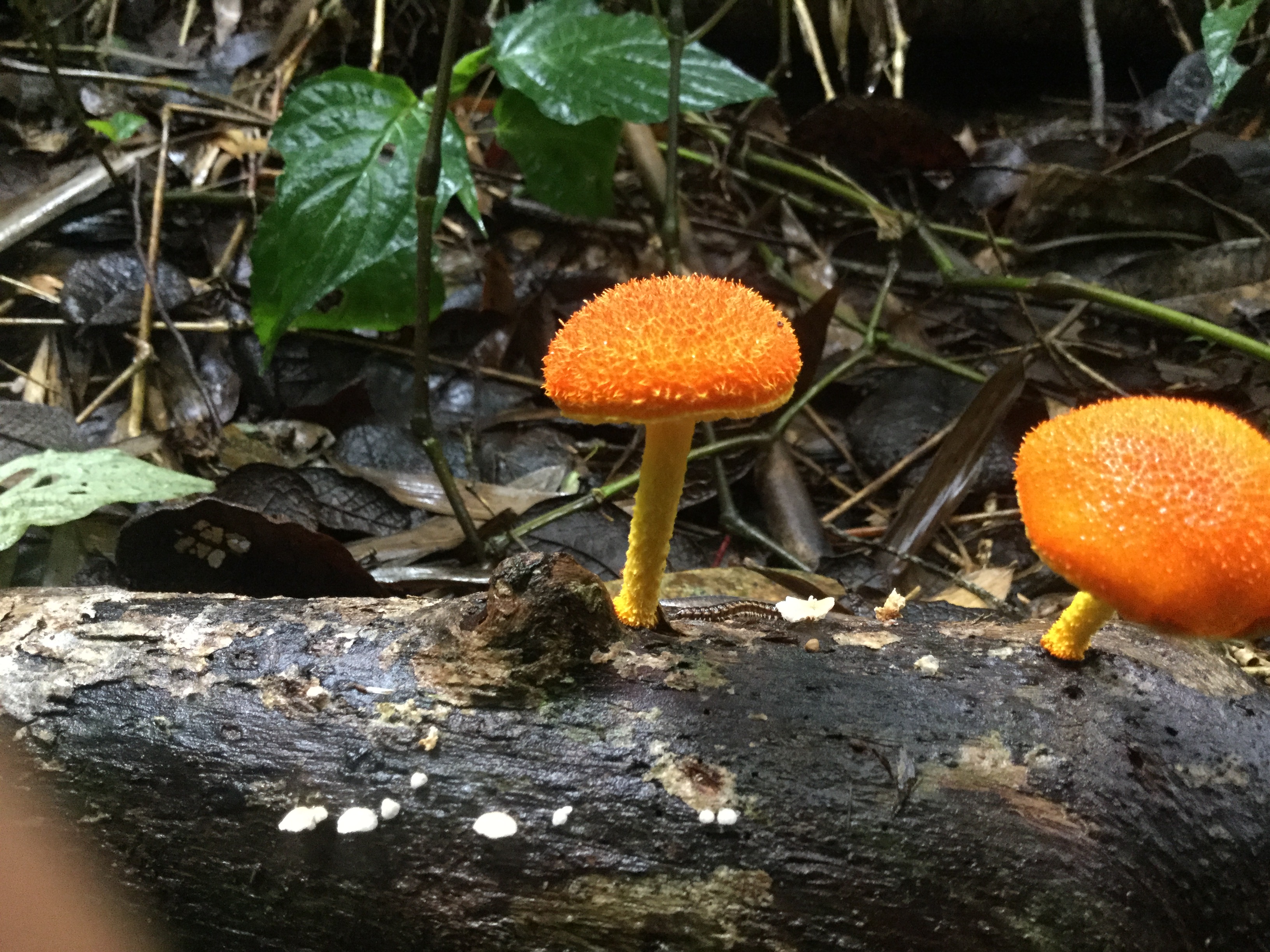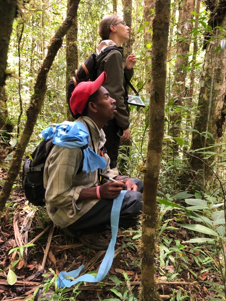 December was a month I had feared: the beginning of rainy season. I’d completed many “little” rainy seasons before in Maromizaha, but this was my first “big” rainy season. Much to our surprise, we had a few afternoon thunderstorms, but no cyclones or major weeks of nonstop rain common to the little rainy season. I wasn’t arguing though, and neither were the reptiles of Maromizaha [Upper and center right], as they began their mating seasons. Our trails remained clear, and the bright red, 15-20 cm millipedes [Upper middle] and brown lemurs [Upper left] took advantage. While these pictures may not look like it, rainy season found us in January. We had a beautiful sunny week amid the rain, with lots of play [Center left], naps in the shade [Center left], and babies that were finally more or less independent from their mothers [Center right]. Our tree marking [Lower right; Photo credit: Grace Davis] got much more challenging in the rain when we learned that sharpies do not write on wet fabric. With all this rain, the fungi [Lower left] came out in full force, showering the forest floor in a confetti of orange, white, blue, red, and brown fruiting bodies.