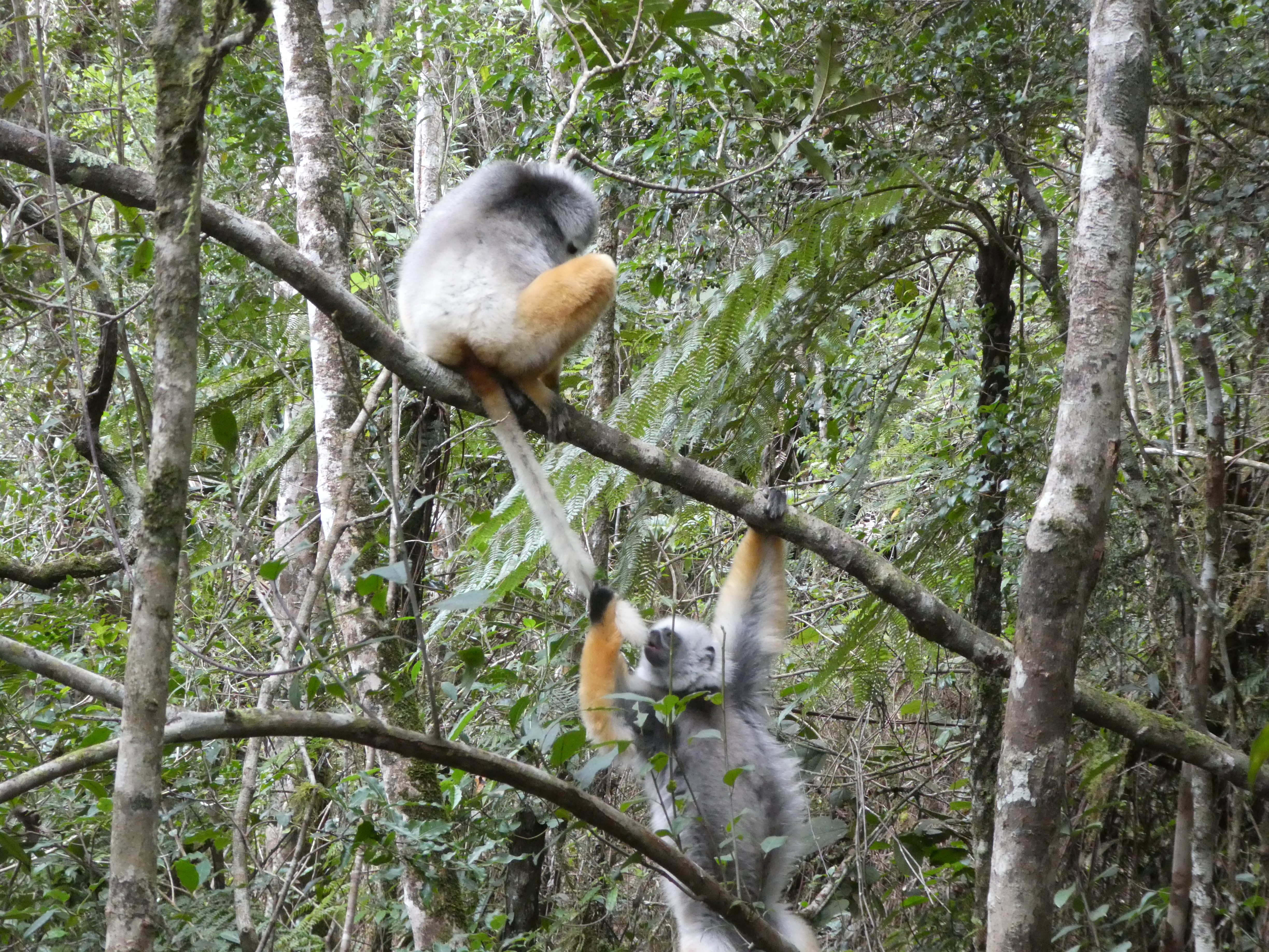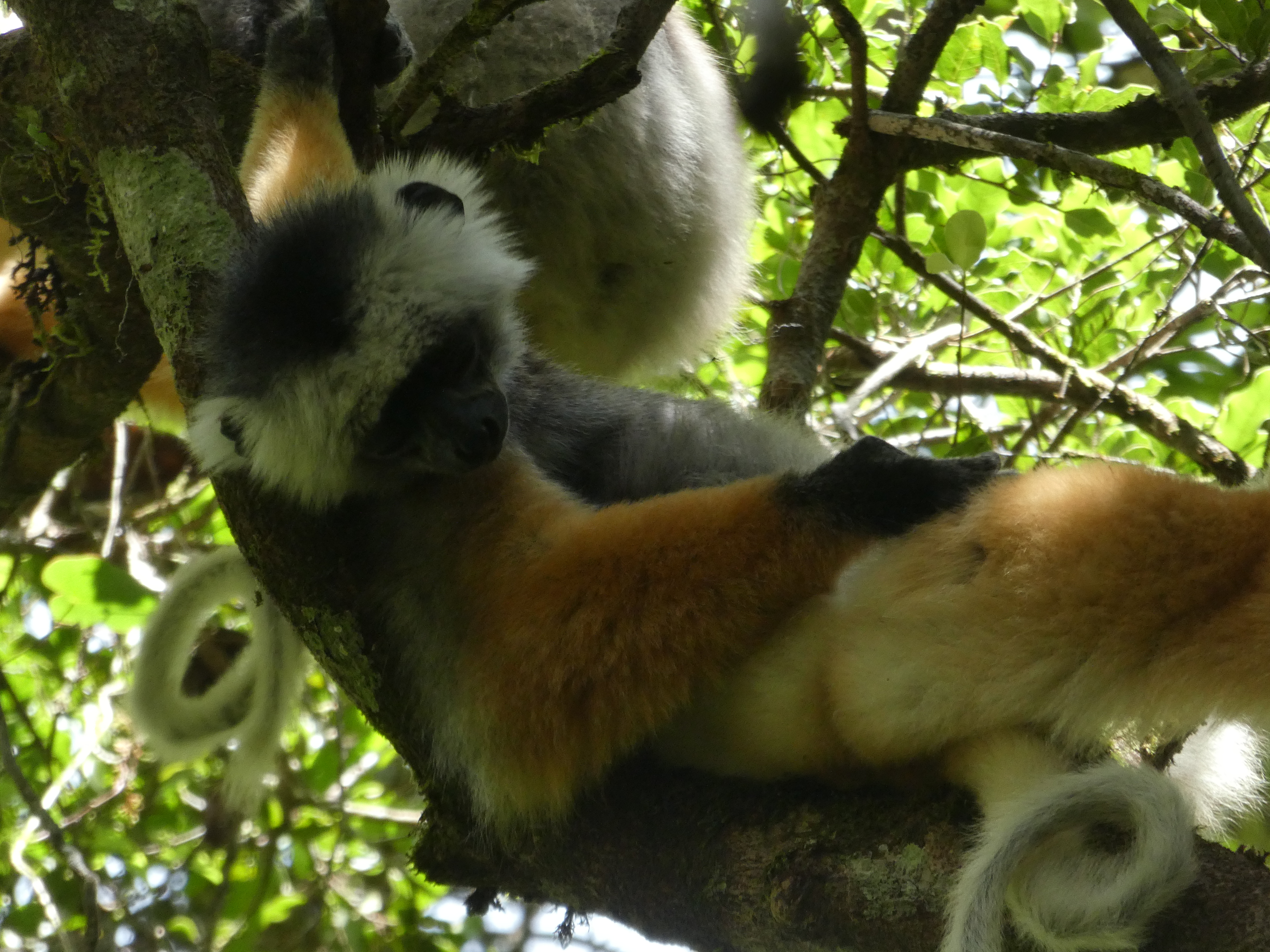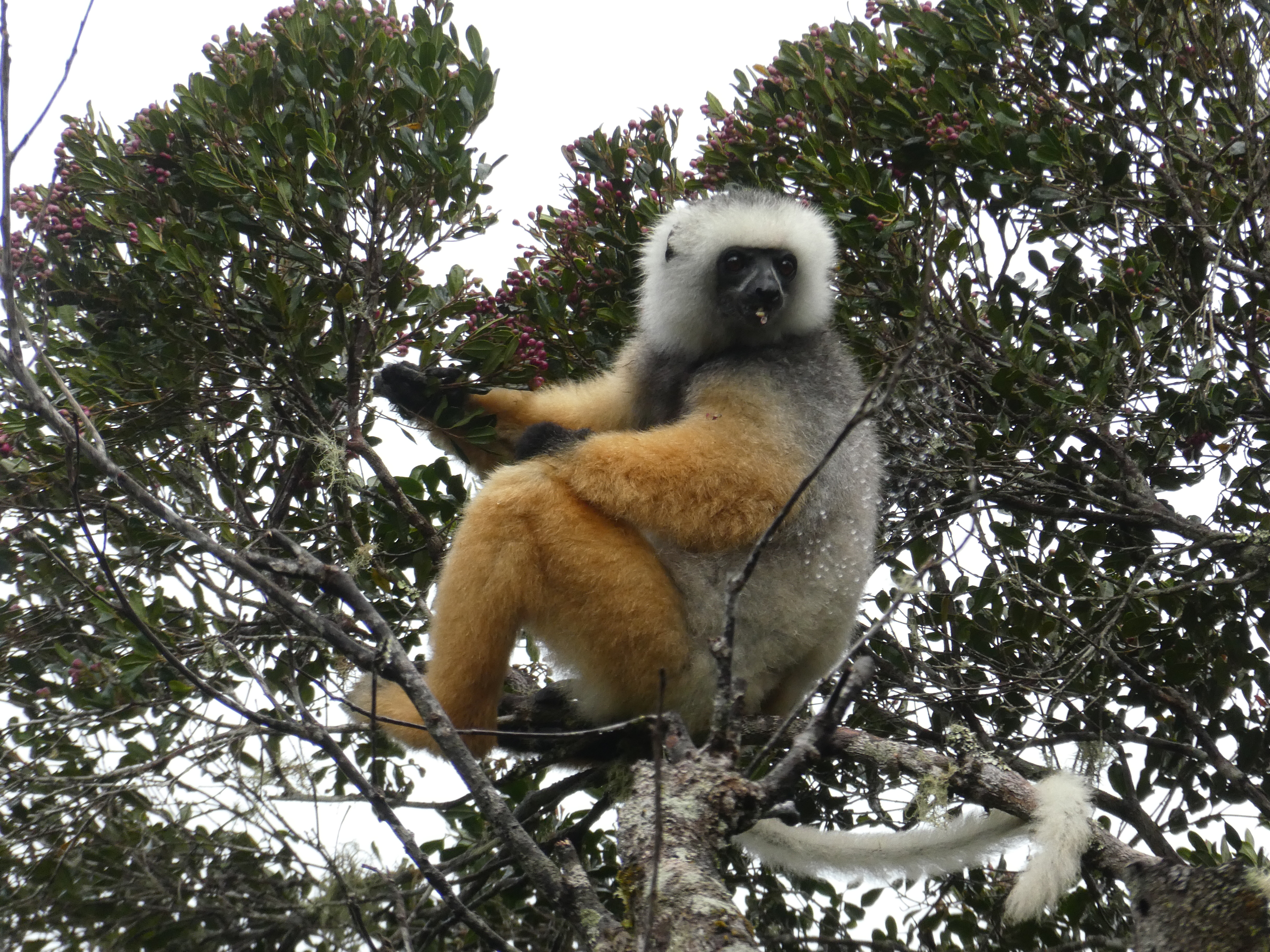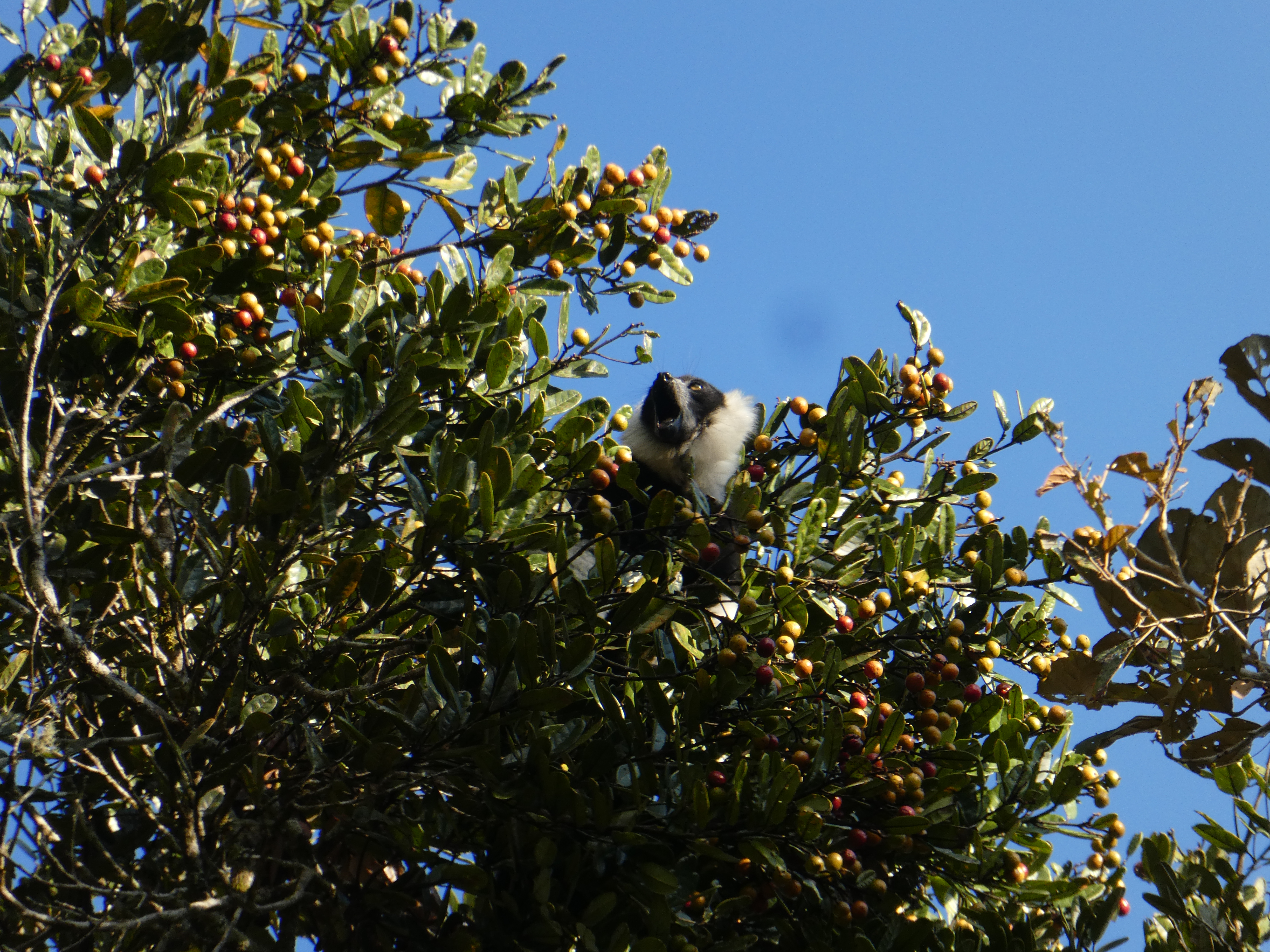 Upon arrival in Madagascar, I was able to attend the 56th annual congress of the Association for Tropical Biology and Conservation, held in Antananarivo, Madagascar [Upper right]. Along side my colleagues, I presented our preliminary findings on diademed and Verreaux’s sifaka (Propithecus verreauxi) social behavior [Upper left; Photo Credit: Rose Marie Randrianarison]. Upon reaching Maromizaha, our field site, my team was greeted by an early start to dry season. Black and white ruffed lemurs (Varecia variegata editorum) and sifaka feasted on the ripening fruits [Center left and lower right], I could take my computer work outside without fear of a rainstorm [Center right], nap time was accompanied by brilliant blue skies [Center left], and we began to watch the new sifaka babies get their characteristic grey and orange fur [Lower right]. All this dryness, well, had to be interrupted by the occasional rainy day just to remind ourselves that we do work in a rainforest. As rotra mena fruit became available [Lower left], we spent day after day at the same trees as both the sifaka and brown lemurs finished off the tiny magenta fruits.