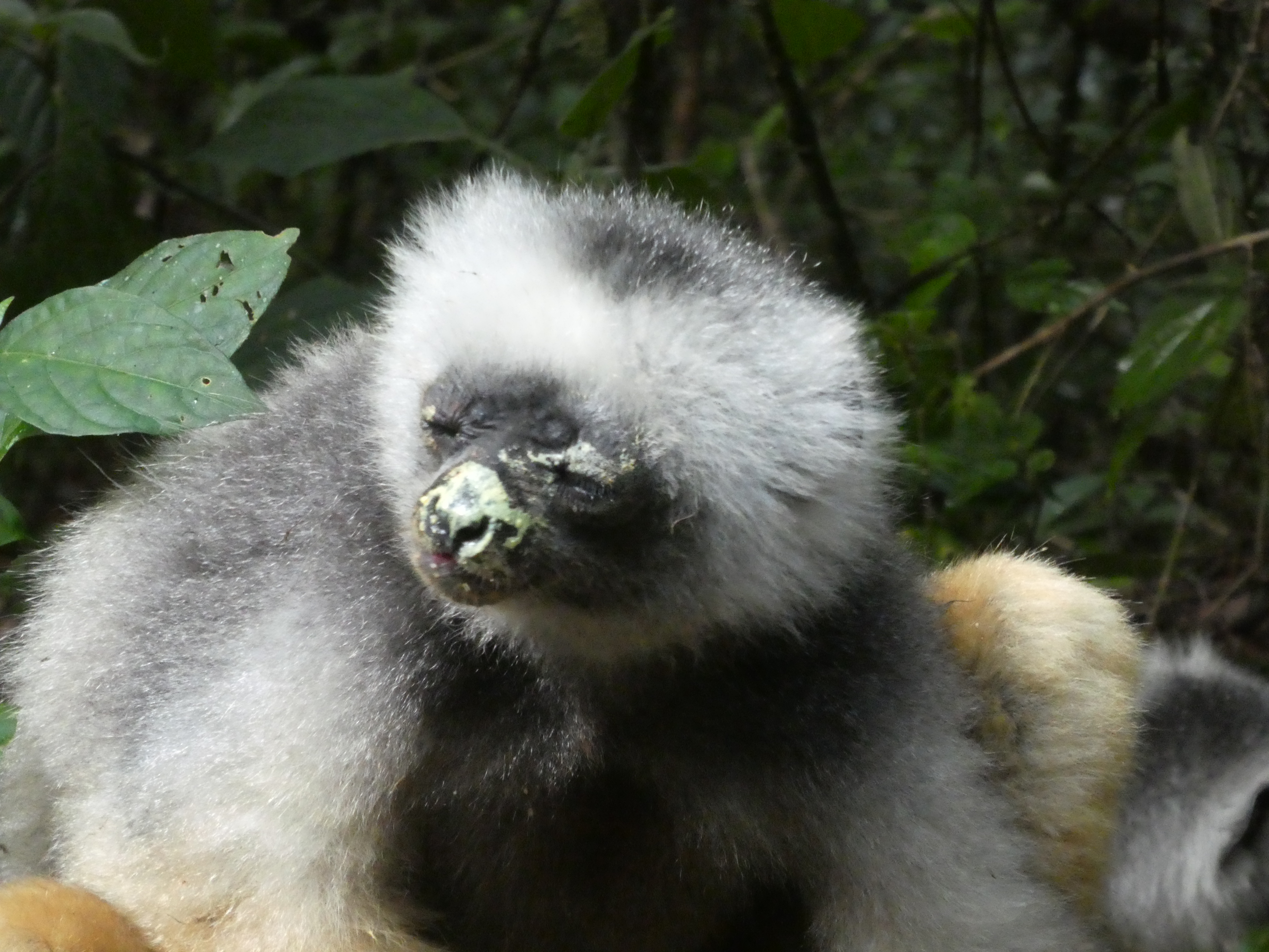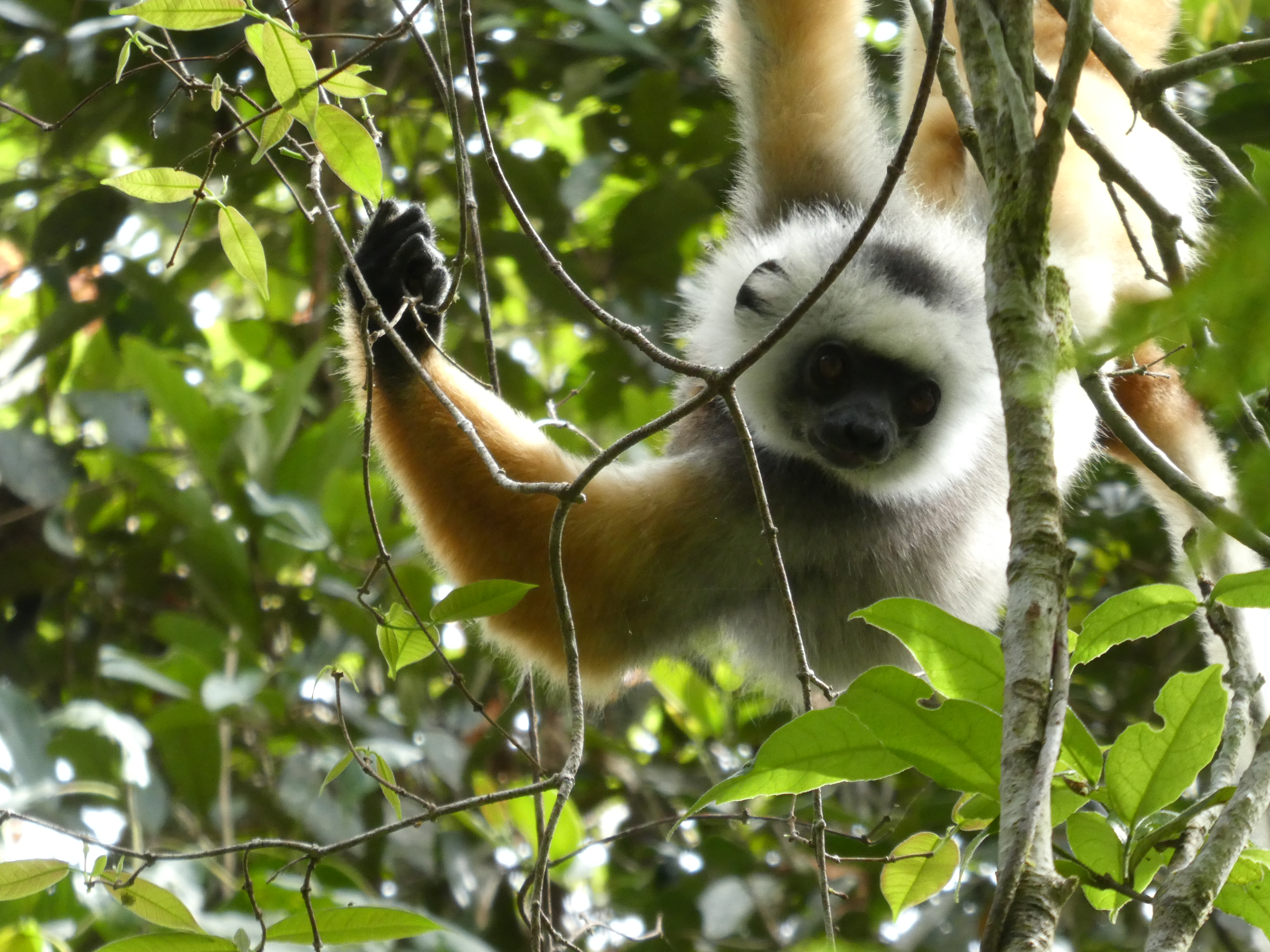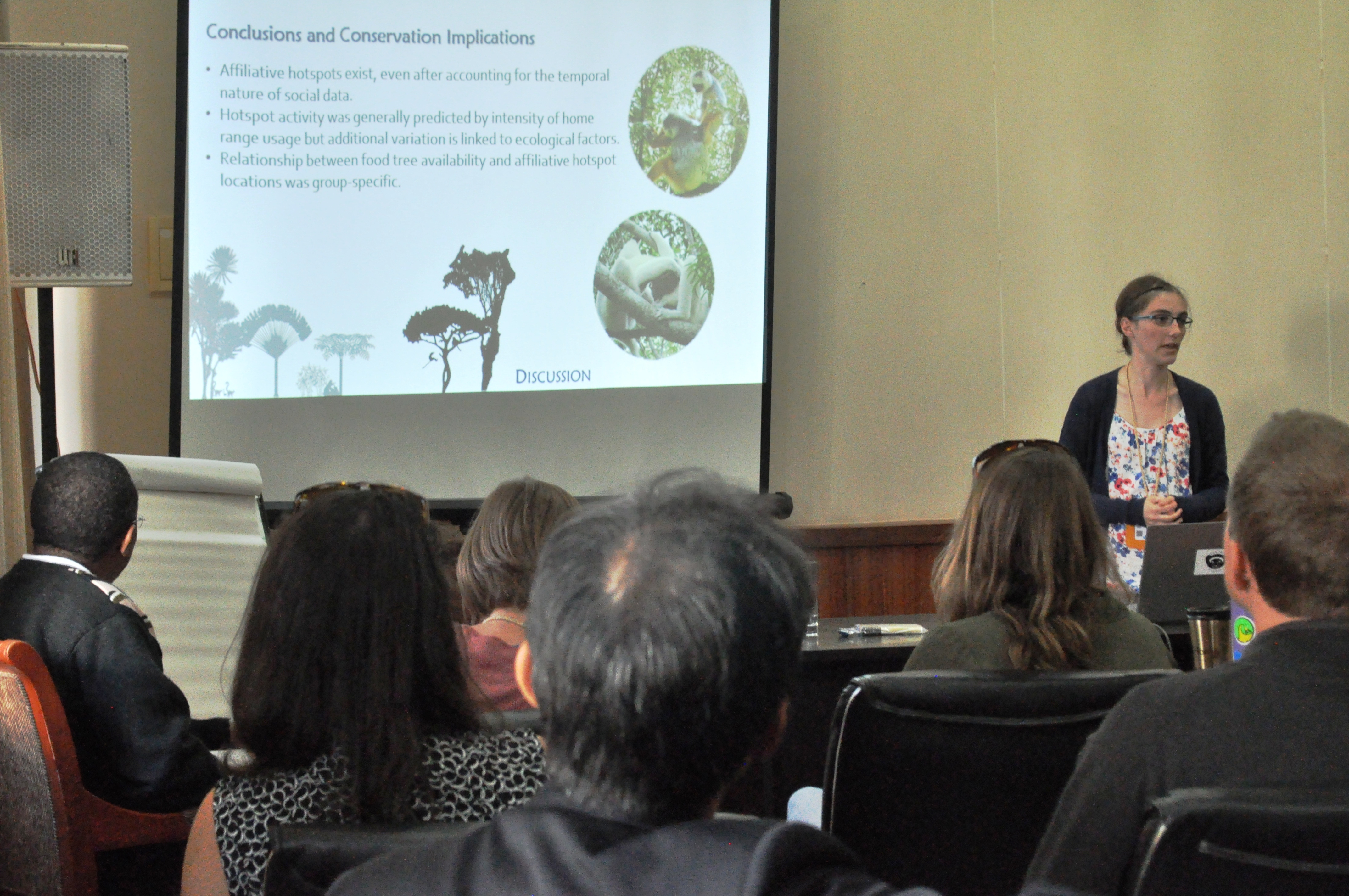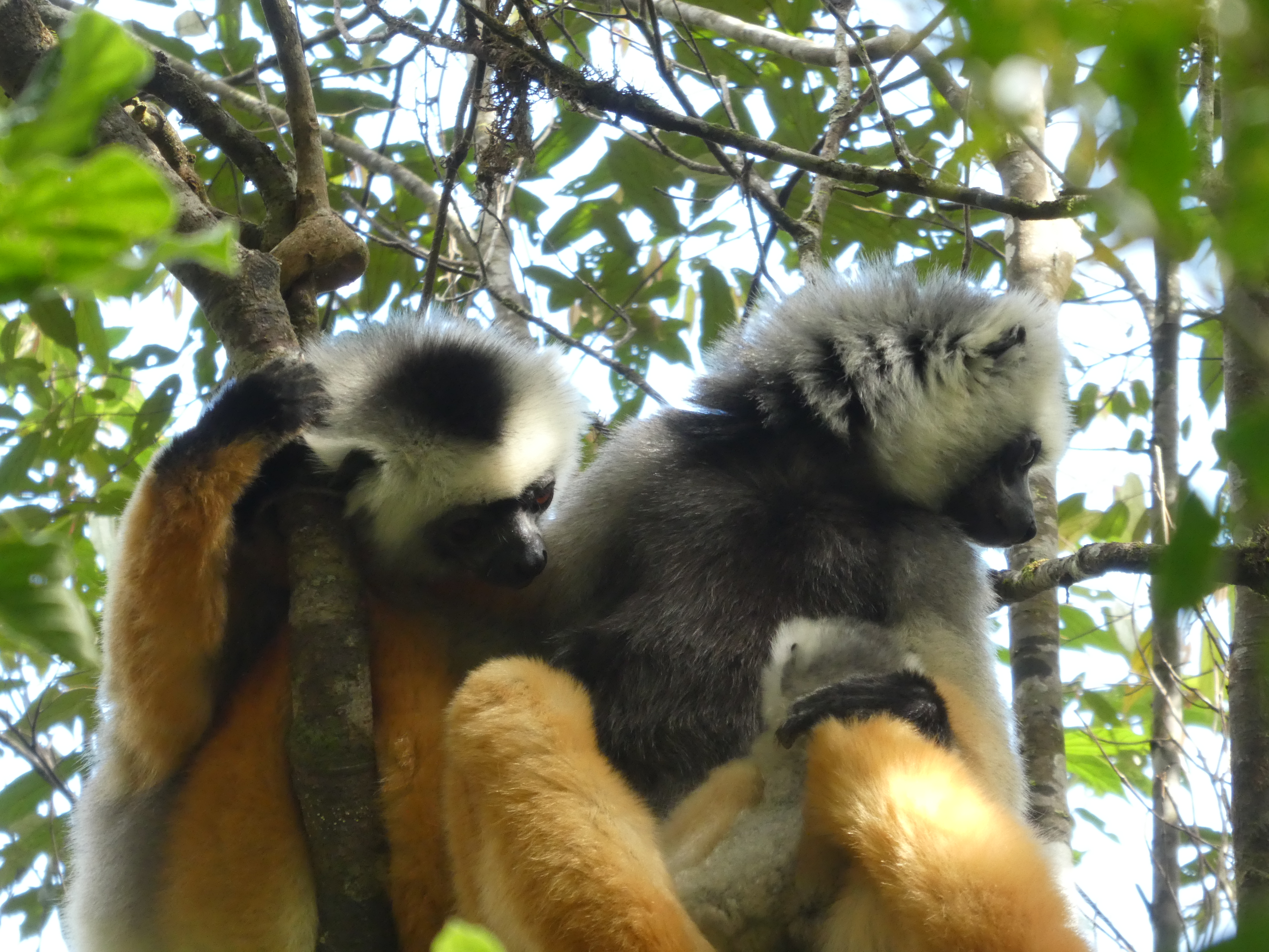 Upon arrival in Madagascar, I was able to attend the 56th annual congress of the Association for Tropical Biology and Conservation, held in Antananarivo, Madagascar [Upper right]. Along side my colleagues, I presented our preliminary findings on diademed and Verreaux’s sifaka (Propithecus verreauxi) social behavior [Upper left; Photo Credit: Rose Marie Randrianarison]. Upon reaching Maromizaha, our field site, my team was greeted by an early start to dry season. Black and white ruffed lemurs (Varecia variegata editorum) and sifaka feasted on the ripening fruits [Center left and lower right], I could take my computer work outside without fear of a rainstorm [Center right], nap time was accompanied by brilliant blue skies [Center left], and we began to watch the new sifaka babies get their characteristic grey and orange fur [Lower right]. All this dryness, well, had to be interrupted by the occasional rainy day just to remind ourselves that we do work in a rainforest. As rotra mena fruit became available [Lower left], we spent day after day at the same trees as both the sifaka and brown lemurs finished off the tiny magenta fruits.