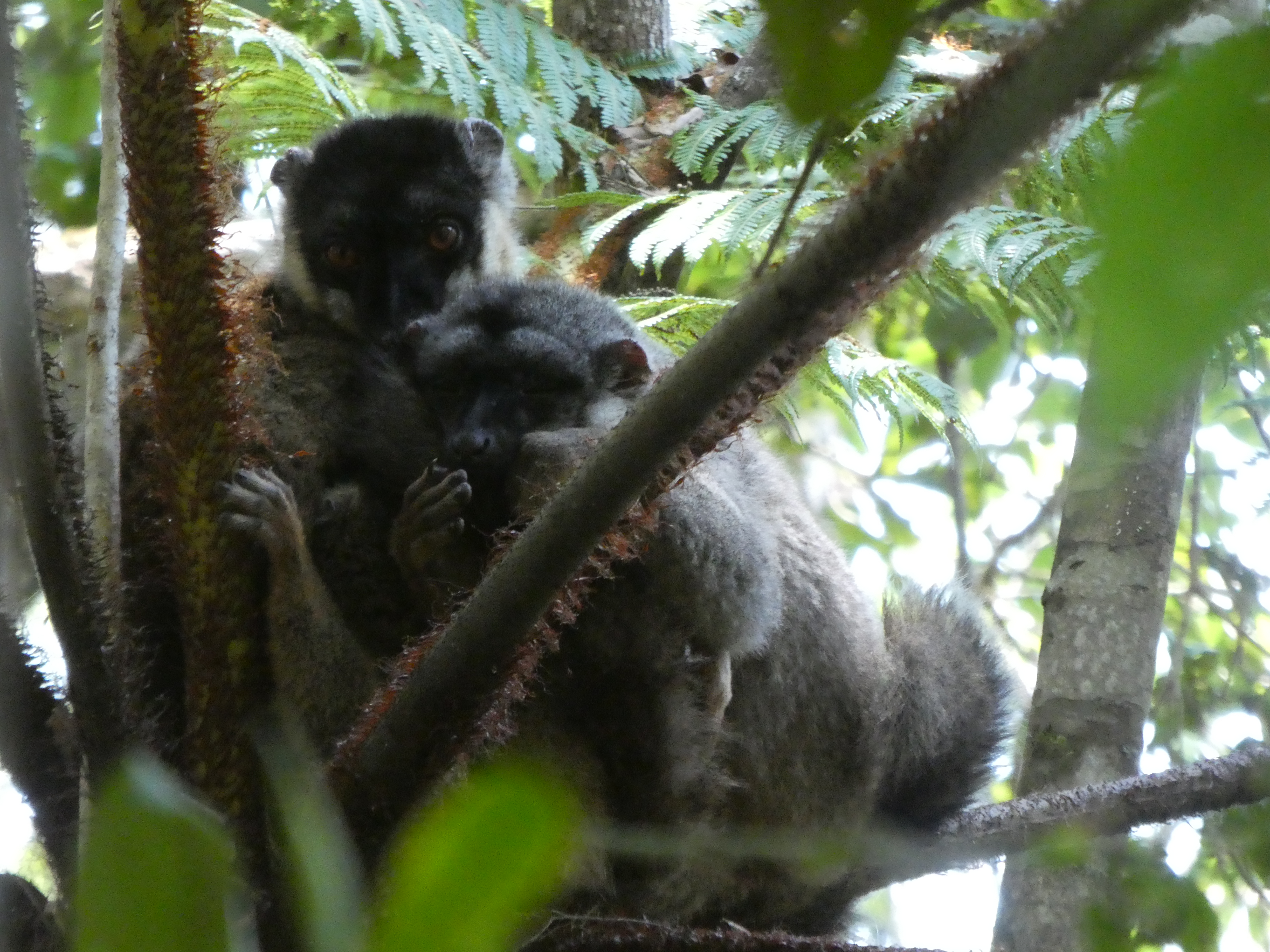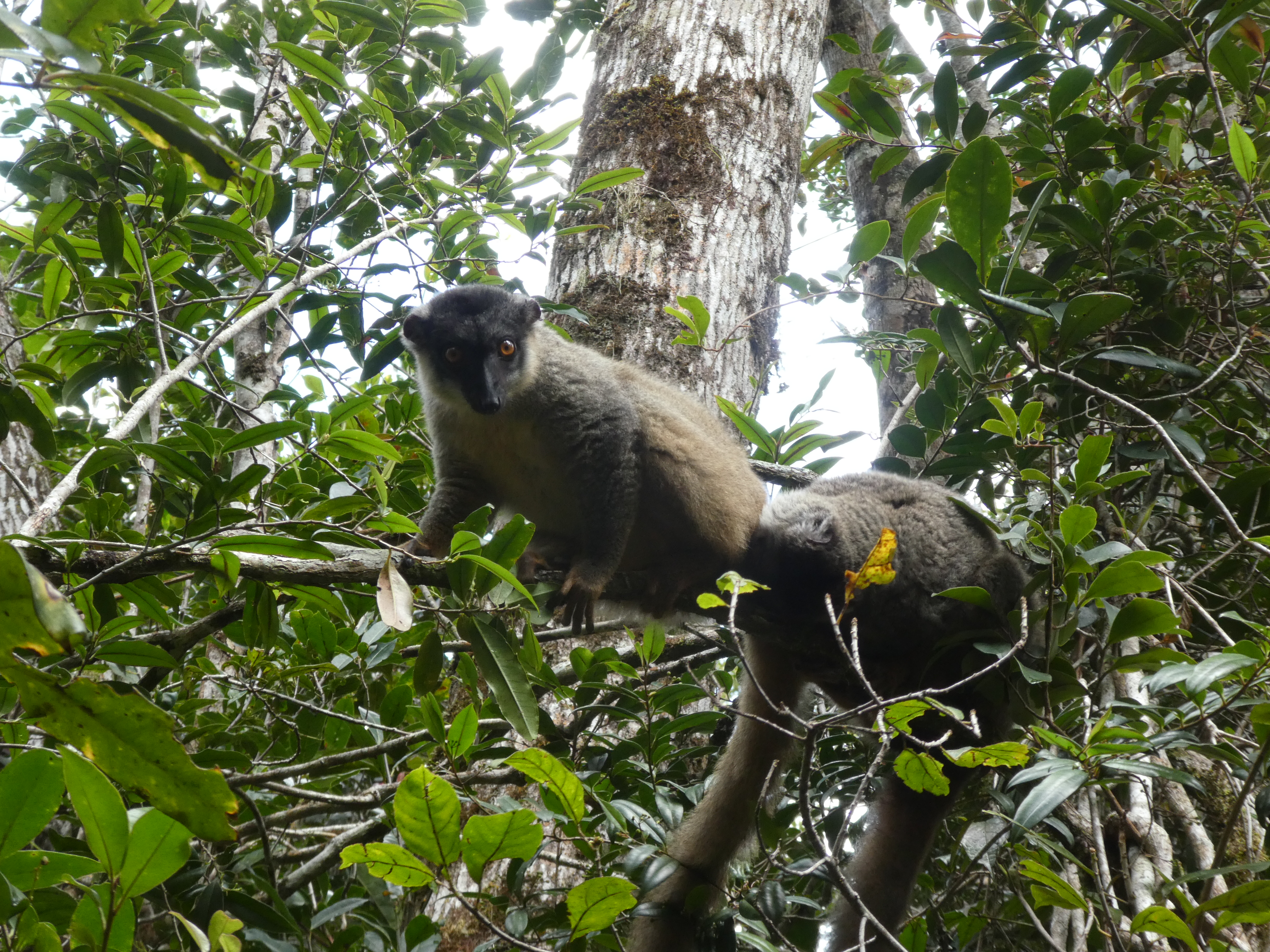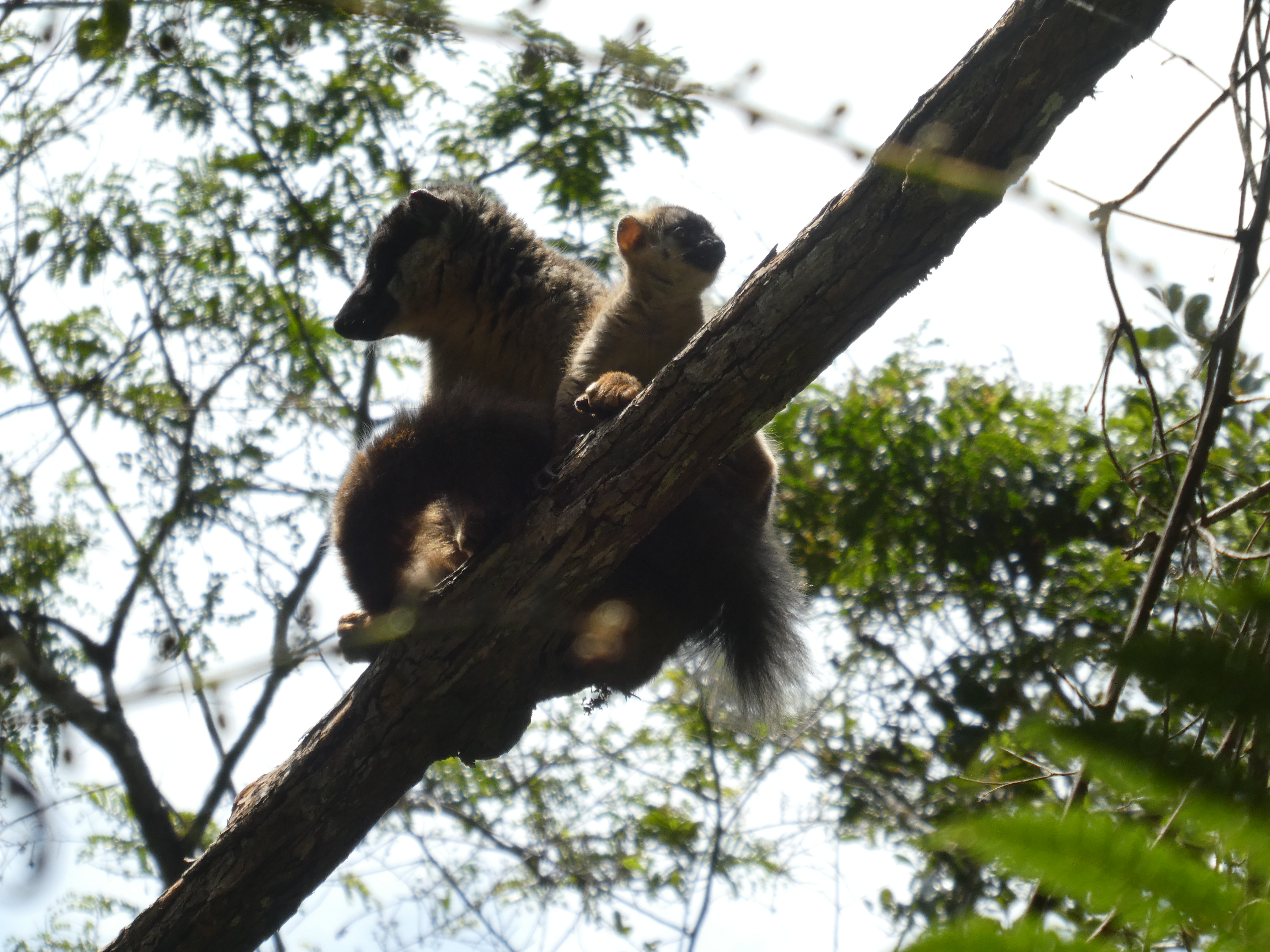 The full emergence of dry season in October and November may be one of my favorite times in Madagascar. In the local market, mangos, lychees, and pineapples abound. In the forest, life bustles (including with the dreaded fuzzy caterpillars [Center right] who frequently clump together on trees) as it’s finally not raining everyday. This season brings the peak play time for the sifaka [Upper and center left]. November also brings ripe kijy, a coconut-sized yellow, sticky fruit. Sifaka are not the cleanest of eaters [Lower right] and will spend hours opening and devouring fruit after fruit [Video]. While these months may be the easiest for sifaka watching, they proved to be what we thought at the time were the hardest for brown lemur watching. Fruit became scarce in the forest (as the kijy fruits are too hard for a brown lemur to break into), making finding the fruit-eating brown lemurs difficult. When we did find them, they too engaged in some social behavior, such as grooming [Center left], albeit for very short intervals. Brown lemurs seemingly have the attention span of, well, a brown lemur, and change behaviors rapidly. Most grooming bouts only last a few seconds, interrupted by feeding on fruit, grooming themselves, or staring into space. In this time, we continued watching the brown lemur babies grow up who in contrast to their sifaka counterparts began moving and feeding independently. When we could find the brown lemurs, they often took their midday seista huddled in the shade on top of tree ferns [Lower middle]. Brown lemurs are cathemeral, meaning that they are active on a 24-hour cycle, rather than just during the day [dirunal] or during the night [noctural]. This means, however, both their days and nights are filled with long periods of sleep – our record was 4.5 hours of watching essentially motionless animals.