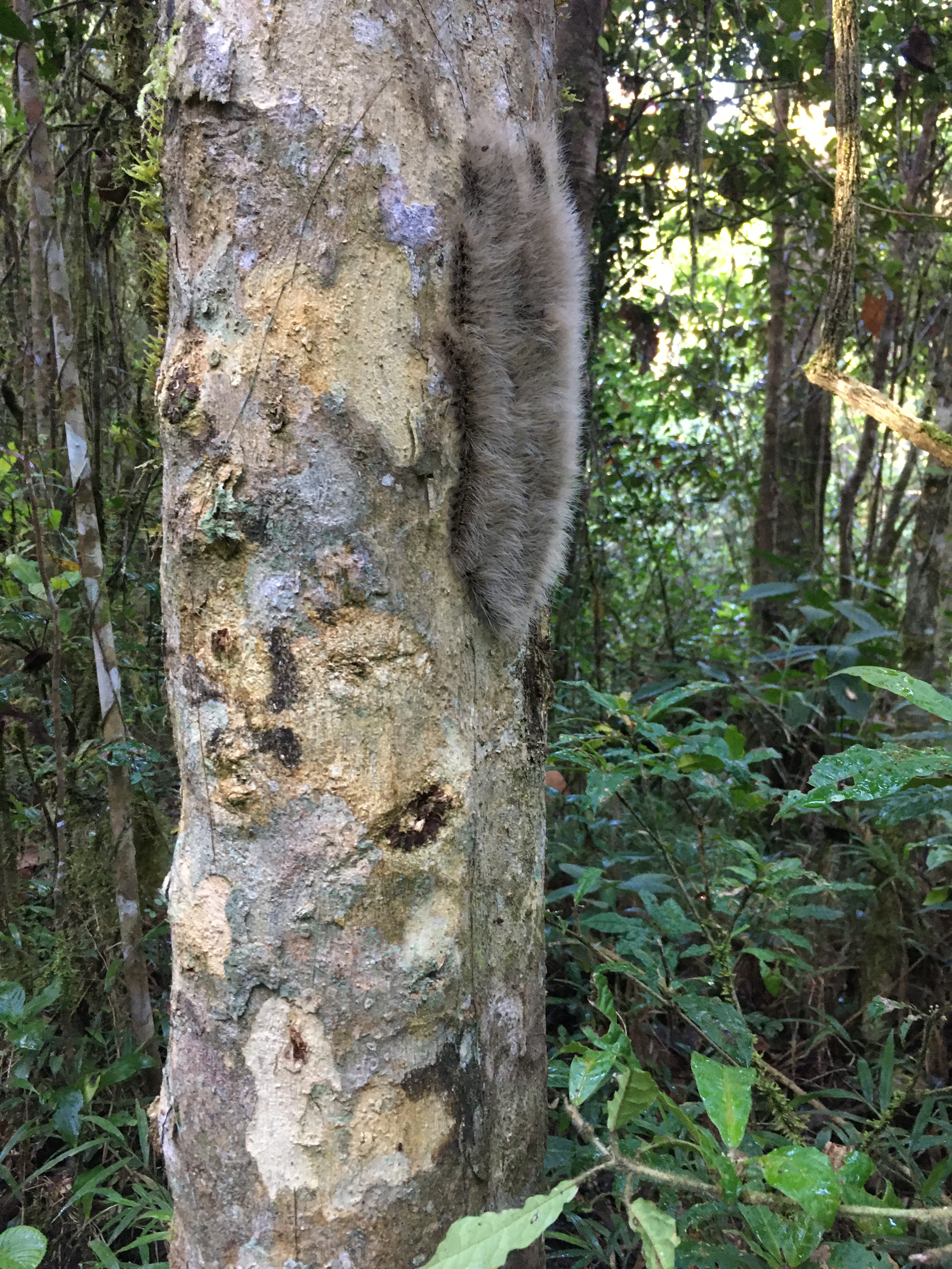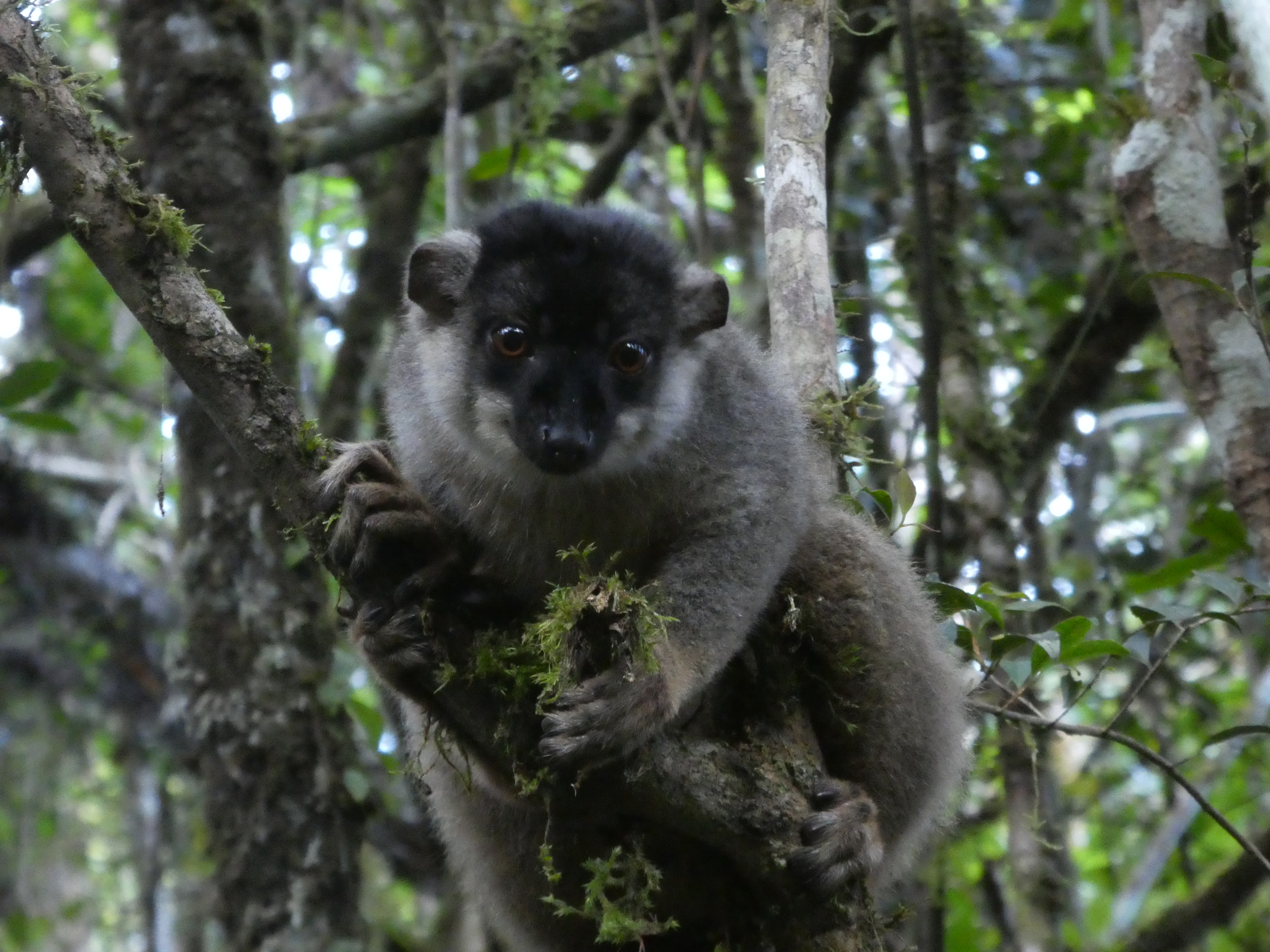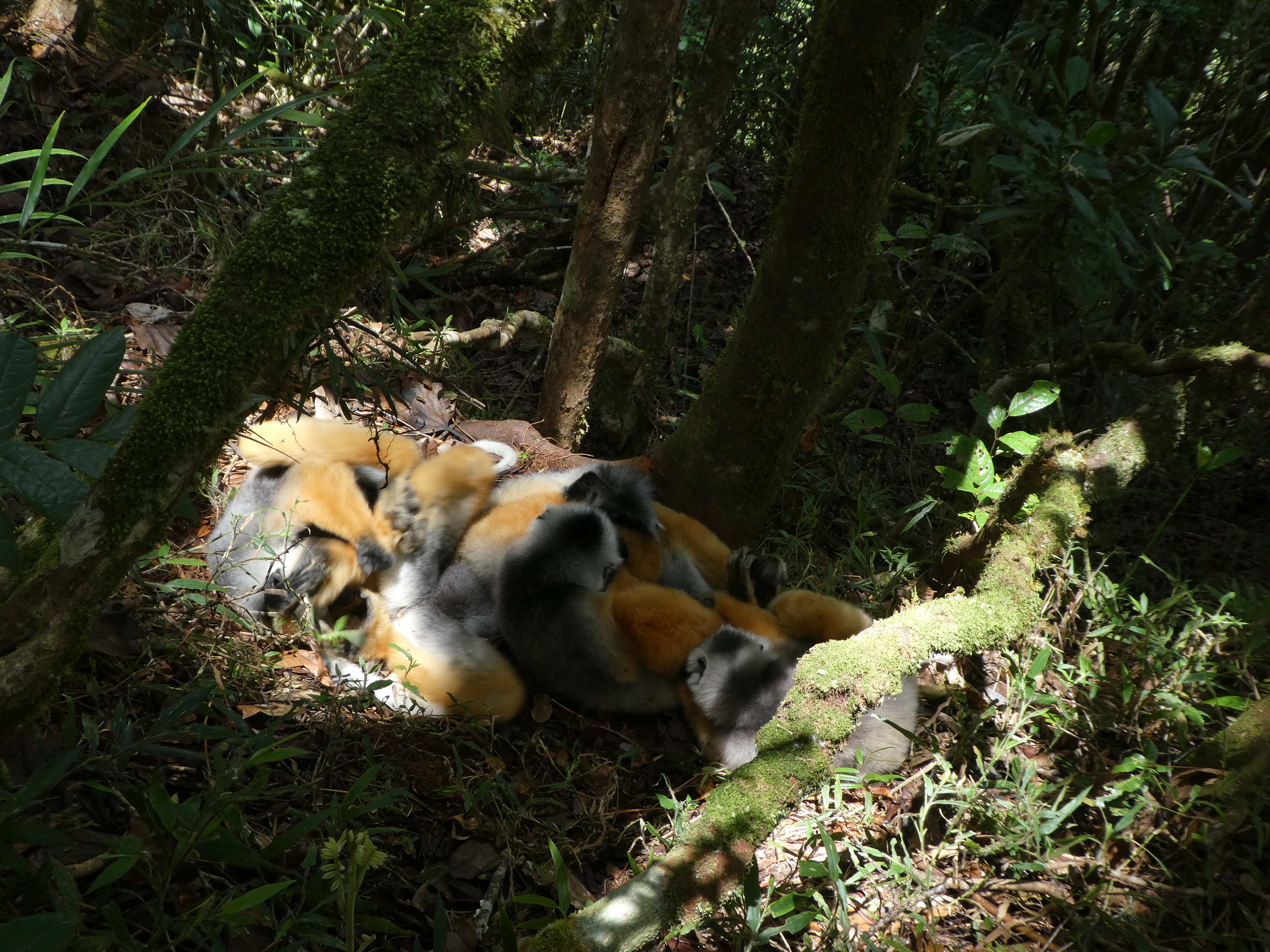 The full emergence of dry season in October and November may be one of my favorite times in Madagascar. In the local market, mangos, lychees, and pineapples abound. In the forest, life bustles (including with the dreaded fuzzy caterpillars [Center right] who frequently clump together on trees) as it’s finally not raining everyday. This season brings the peak play time for the sifaka [Upper and center left]. November also brings ripe kijy, a coconut-sized yellow, sticky fruit. Sifaka are not the cleanest of eaters [Lower right] and will spend hours opening and devouring fruit after fruit [Video]. While these months may be the easiest for sifaka watching, they proved to be what we thought at the time were the hardest for brown lemur watching. Fruit became scarce in the forest (as the kijy fruits are too hard for a brown lemur to break into), making finding the fruit-eating brown lemurs difficult. When we did find them, they too engaged in some social behavior, such as grooming [Center left], albeit for very short intervals. Brown lemurs seemingly have the attention span of, well, a brown lemur, and change behaviors rapidly. Most grooming bouts only last a few seconds, interrupted by feeding on fruit, grooming themselves, or staring into space. In this time, we continued watching the brown lemur babies grow up who in contrast to their sifaka counterparts began moving and feeding independently. When we could find the brown lemurs, they often took their midday seista huddled in the shade on top of tree ferns [Lower middle]. Brown lemurs are cathemeral, meaning that they are active on a 24-hour cycle, rather than just during the day [dirunal] or during the night [noctural]. This means, however, both their days and nights are filled with long periods of sleep – our record was 4.5 hours of watching essentially motionless animals.